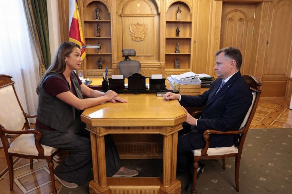 В региональном Правительстве состоялась встреча главы Донского региона Юрия Слюсаря с председателем Союза женщин России, известной российской телеведущей Марией Ситтель. На повестке обсуждения стояли вопросы поддержки военнослужащих и их родных, а также помощи донским семьям с детьми. Мария Ситтель отметила, что региональное отделение Союза женщин России принимает активное участие в разных общественных и благотворительных проектах. «Наши девчата оказывают адресную помощь. Вот сегодня передавали гуманитарную помощь бойцам в госпитале и поедем еще. Встретимся с семьями участников СВО», — рассказала глава Союза женщин России. Глава Донского региона выразил благодарность Марии Ситтель за участие в региональном форуме «Стратегия 2030», на котором подвели предварительные итоги общественного обсуждения предложений по обновлению Стратегии развития области до 2030 года. Юрий Слюсарь подчеркнул, что вопросы поддержки материнства, детства, помощи участникам СВО и их семьям будут отражены в оконча