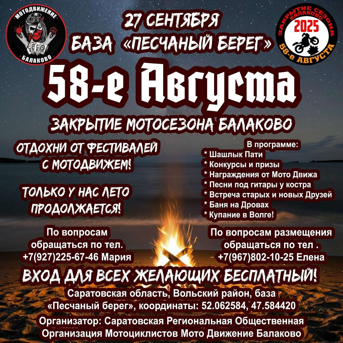 ✏️ Дальняк.рф™: 27 сентября ждем всех в гости!!! Отдохните от Мото Фестов вместе с Мото Движем. Вход для Всех бесплатный. В программе не будет концерта. Будет: * Шашлык Пати * Конкурсы и призы * Награждения от Мото Движа * Песни под гитары у костра * Встреча старых и новых Друзей * Обнимашки * Баня на Дровах и купание в Волге! Закрывай сезон КРАСИВО вместе с Мото Движем! Продукты и напитки гости привозят с собой. Саратовская область, Вольский район, база отдыха "Песчаный берег" Размещение в домиках и палатках. По вопросам размещения обращаться по тел 89678021025 Елена