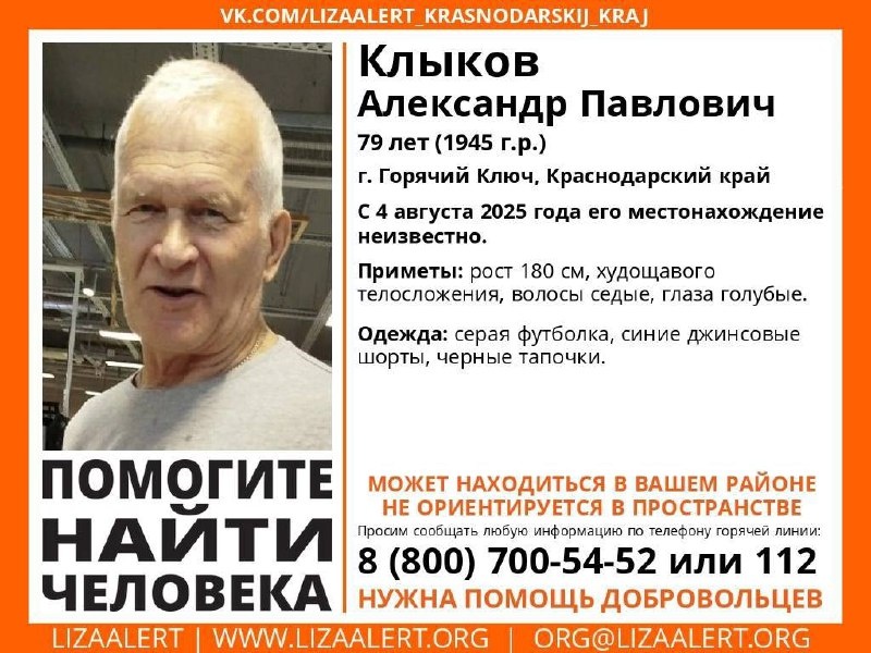 ⚡️⚡️⚡️⚡️ Нужна помощь в поисках! #Клыков Александр Павлович, 79 лет (1945 г.р.), ушел из дома еще 4 августа 2025 года, до сих пор его местонахождение неизвестно. ❗️Завтра, 6 августа, поисковики ЛизаАлерт снова идут на поиски. Нужны люди, хорошо знающие окрестности Горячего Ключа. С собой иметь: аккумуляторы, фонари, воду, перекус. Инфорг поиска: Лиляна 8 (918) 6680428 Горячая линия отряда: 8 800 700 5452 (звонок бесплатный)