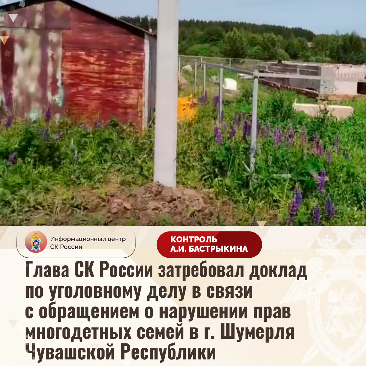 Глава СК России затребовал доклад по уголовному делу в связи с обращением о нарушении прав многодетных семей в г. Шумерля Чувашской Республики К Председателю СК России А.И. Бастрыкину в его приёмную «ВКонтакте» поступило обращение жителя Чувашской Республики по вопросу нарушения прав многодетных семей и семей с детьми-инвалидами из города Шумерля. В 2015 году льготным категориям граждан предоставлены земельные участки, непригодные для освоения в связи с отсутствием систем водоснабжения и водоотведения. Несмотря на судебное решение, обязавшее провести инженерные коммуникации к домовладениям, до настоящего времени права семей не реализованы. Многочисленные обращения в различные инстанции результатов не принесли. Указанная ситуация освещалась в СМИ. Ранее А.И. Бастрыкин поручал представить по ней доклад. В СУ СК России по Чувашской Республике возбуждено уголовное дело. Председатель Следственного комитета Российской Федерации Александр Иванович Бастрыкин затребовал у руководителя СУ СК Рос
