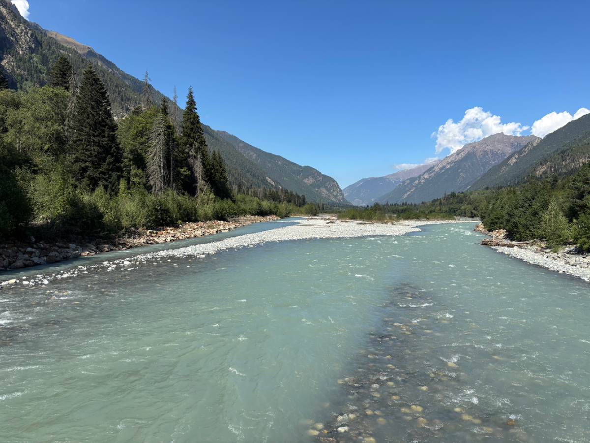 5 сентября, мы во второй раз в Домбае. Про первое путешествие можно почитать тут👇🏻 В этот раз мы решили посетить Бадукские озера. На улице солнечно, тепло, поэтому снаряжение максимально легкое. С Военно-Сухумской дороги свернули и сразу уперлись в шлагбаум. «Начальник» опоздал на 10 минут, и ещё 20 минут ушло на парковку, сборы, переход по подвесному мосту через реку Теберду, оплату на КПП (300₽ с человека). На маршруте мы были вторые: две девушки-спортсменки ушли и видели мы их только на финише через 4000 м. Дорога преимущественно вверх, земляная с торчащими камнями и корнями. Узких троп почти нет, так что столкновения и столпотворения исключены. Через 40 минут пути мы достигли отметки 2000 м, где перешли по мосту бурлящую шумную воду и снова погнали вверх. Ещё ровно час ушло на следующие 2000 м. Этот путь оказался сложнее: то ли круче был подъем, то ли усталость сказывалась. (К тому же вчера мы тоже были на нелегком маршруте, и, может, ещё организм не восстановился от нагрузо