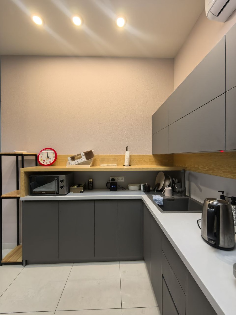 Не большая кухня служит как кухня и как великом зона для гостей выше проект, а это реализация.
