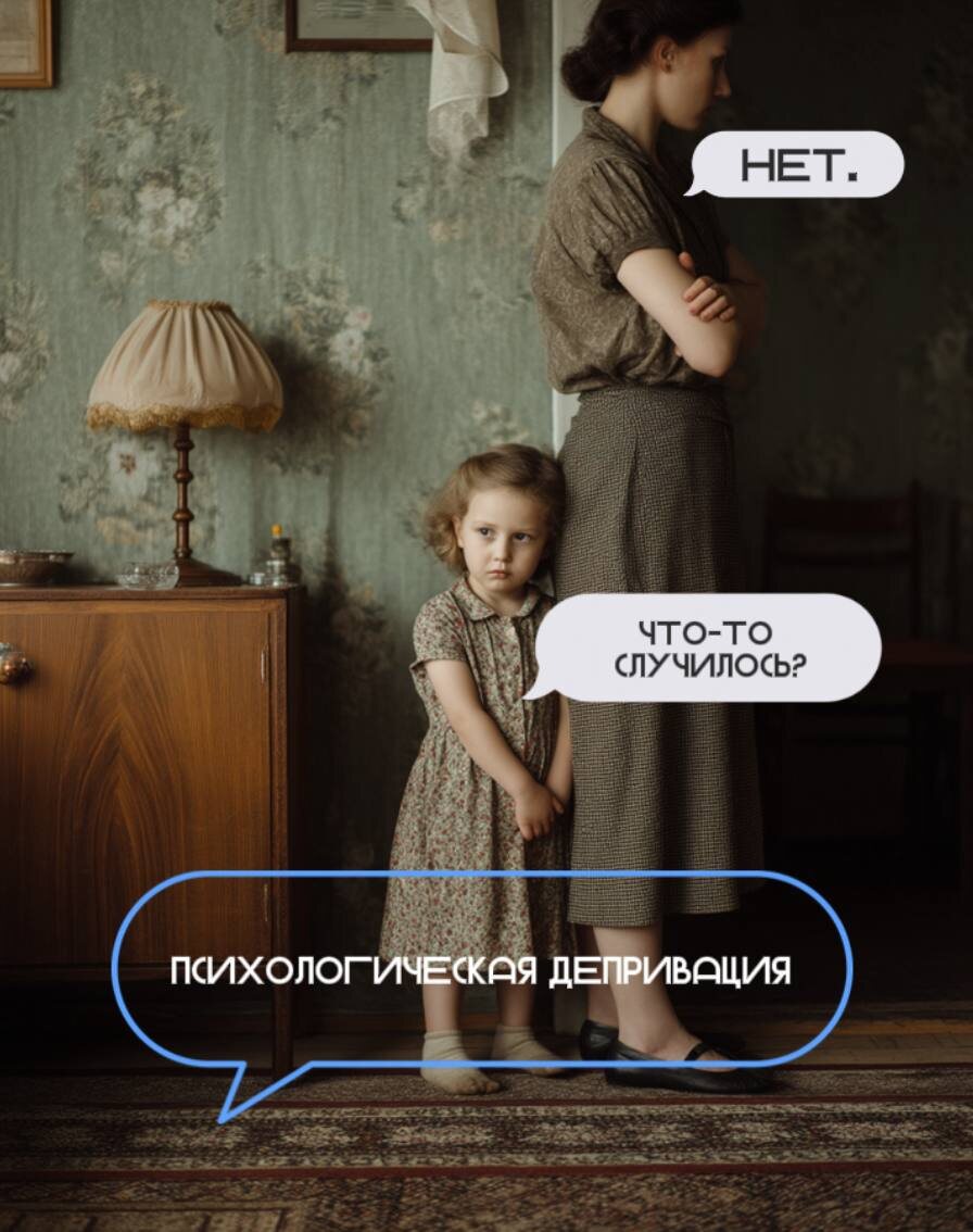 Все мы знаем, что такое психологическая депривация (ПД). Все пробовали ее на вкус. [ПД — это длительное лишение человека эмоциональных или социальных условий, которые необходимы для нормального развития психики] Не разовый эпизод, а постоянный дефицит. Ничего вроде не произошло, но с тобой не разговаривают и проявляют холод. Когда депривация становится фоном, психика перестраивается. Она учится выживать в условиях нехватки. ЧТО МЕНЯЕТСЯ? Нарушается способность к саморегуляции Когда рядом нет внешнего «успокаивающего объекта», не формируется и внутренний. Взрослея, человек ощущает пустоту и ищет регуляцию в других людях, еде, работе, зависимостях. Формируется гиперчувствительность к отвержению Даже нейтральное «нет» или молчание воспринимаются как угроза существованию. Реакции становятся сильнее повода. Искажается образ себя Без подтверждения ценности и важности психика усваивает: «я недостаточен», «меня можно заменить». Это превращается в фильтр восприятия. Ограничивается с