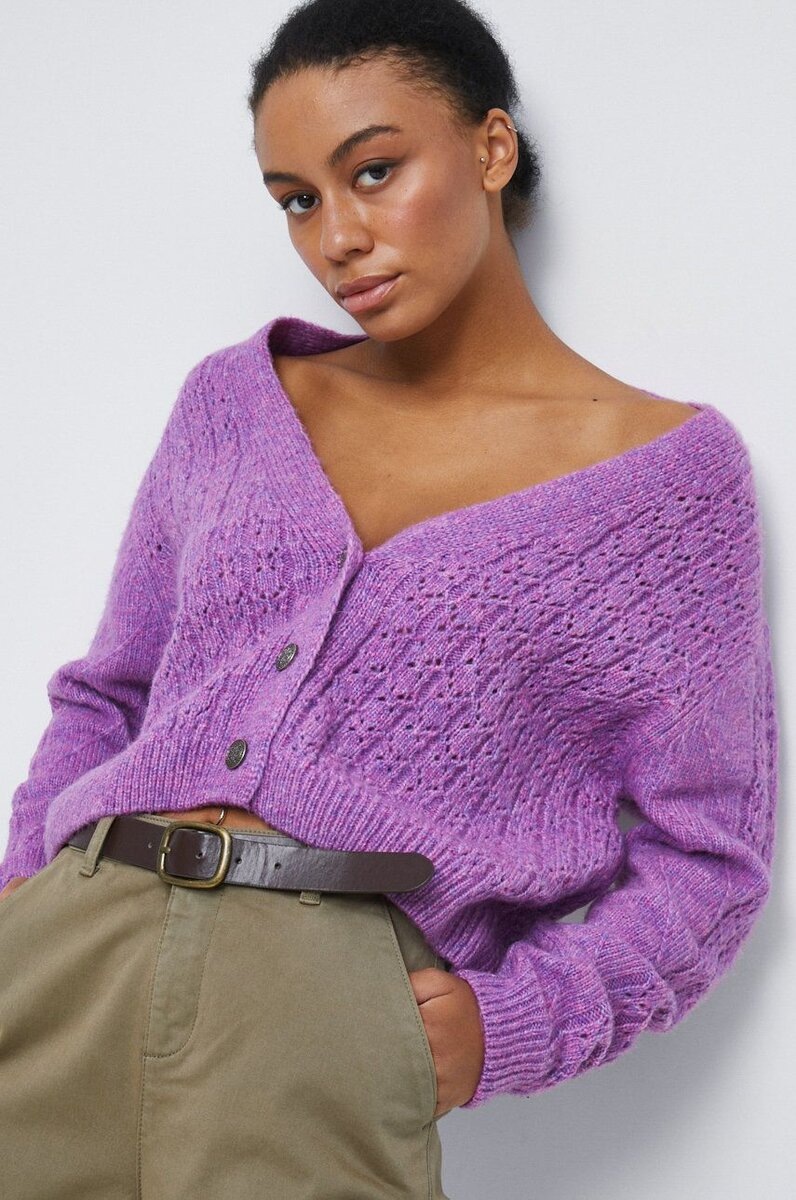 Яркий фиолетовый кардиган. Модель свободная, укороченная, с мелким вертикальным ажурным узором. Узор этот нераспространенный, смотрится интересно.