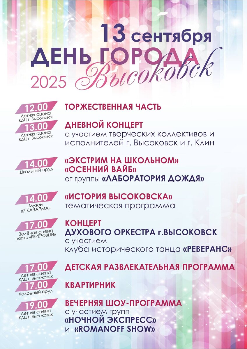 🤩🤩🤩🤩🤩🤩 🎉День города Высоковска — 1️⃣3️⃣ сентября! 🎉 1️⃣2️⃣⏺️0️⃣0️⃣ - Торжественное награждение на Летней сцене КДЦ. - Мастер-классы на Центральной площади парка "Берёзовый". 1️⃣3️⃣⏺️0️⃣0️⃣ — Концерт творческих коллективов Высоковска и Клина. 1️⃣4️⃣⏺️0️⃣0️⃣ - Триатлон "Экстрим на Школьном" (поддержите участников!). - История Высоковска в музее "7 казарма". 1️⃣7️⃣⏺️0️⃣0️⃣ - Концерт духового оркестра с клубом "Реверанс" в парке "Берёзовый". - Детская развлекательная программа. - Традиционный квартирник у Холодного пруда. 1️⃣9️⃣⏺️0️⃣0️⃣ — Вечерняя шоу-программа на Летней сцене КДЦ: Кавер-группы "НОЧНОЙ ЭКСПРЕСС" и ROMANOFF SHOW с мировыми хитами и энергией! 💙🤩🤩🤩🤩🤩 МОЛОДЕЖНОЕ ТВ #клин #клинзвучит #молодежноеТВ