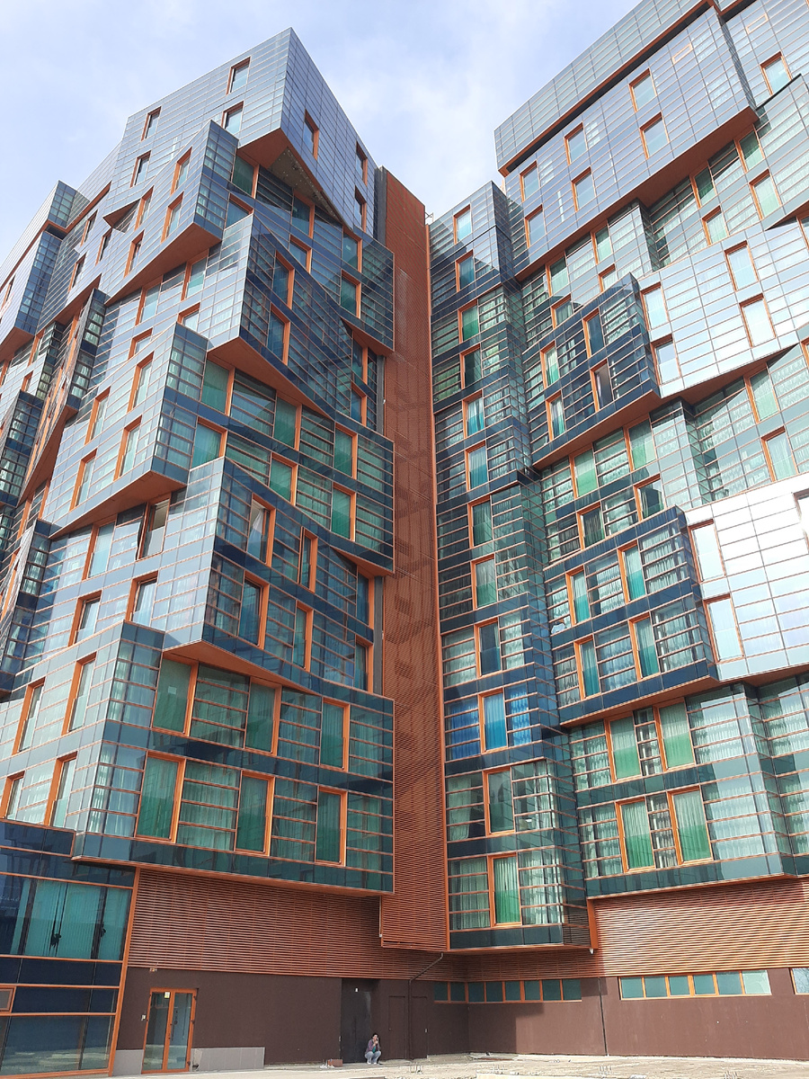 Построен этот комплекс из 3-ёх 14-этажных блоков был по проекту итальянского архитектурного бюро - именно в том стиле, как я и написала в ролике - хай-тек, кубизм. Где-то видела фразу -"Такого здания в Анапе ещё не было, и пожалуй, никогда уже не будет" - вот эта нотка сожаления во второй части для меня прямо лишняя. Не будет, и не надо - на анапская это история, Анапе идёт патриархальный классический стиль, а не кубическое нагромождение стекла и металла. Но это опять же моё личное мнение.