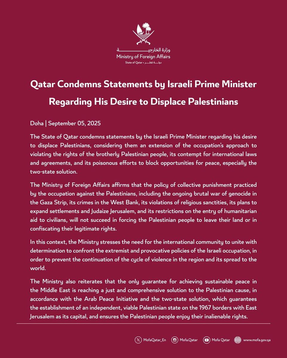 Катар выступил с осуждением заявления премьер-министра Израиля о том, что палестинцы должны иметь возможность уехать в другие страны. Напомню, Нетаньяху заявил: "Мы не стремимся их изгонять. Но запирать их внутри? Насильно? Где же все защитники прав человека?" В ответ Катар "осудил заявления премьер-министра Израиля о его намерении вытеснить палестинцев, считая их продолжением оккупационной политики, нарушающей права братского палестинского народа, демонстрирующей пренебрежение международными законами и соглашениями и направленной на разрушение возможностей для мира, особенно для решения на основе двух государств". В тексте также содержится обвинение Израиля в организации геноцида. Такой вот интересный посредник...
