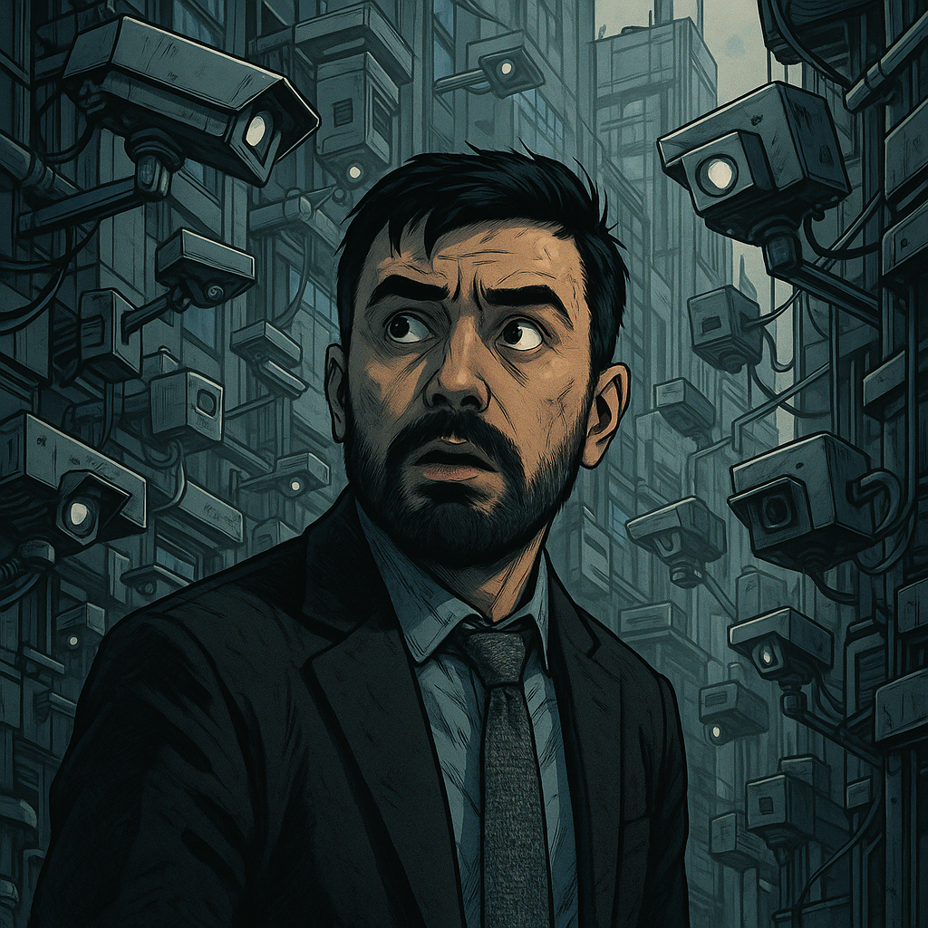 Я брёл по улицам уже, наверное, час, но время будто потеряло счёт. Всё выглядело одинаково: ровные серые фасады, одинаковые люди с одинаковым выражением лиц. И что хуже всего — камеры. Они были везде. На углах домов, в фонарях, даже на некоторых деревьях. Лампочки на них то вспыхивали красным, то гасли, как будто подмигивали, фиксируя каждый мой шаг.