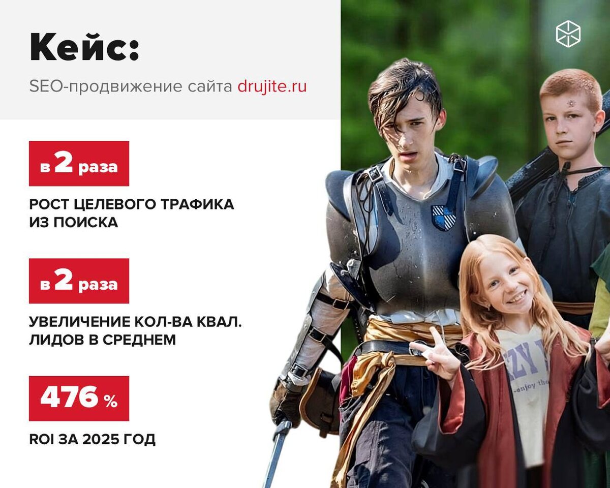 Из промышленности в детство ➡️ как мы удвоили трафик детскому лагерю «Дружите» Обычно мы разбираемся со станками, металлообработкой и тяжелой промышленностью. Но когда к нам пришел детский лагерь «Дружите», поняли: пора отложить чертежи гидравлических прессов и вспомнить, как пахнет костер и как звучит вечерняя «Зарница». И знаете что? Промышленный подход к SEO в детской теме работает на ура. Что было и что стало Февраль 2024 (точка отсчета нашей работы с клиентом) - сезон впереди, а сайт проседает: трафик стагнирует, родители теряют лагерь в поиске. Мы закатали рукава (ну ладно, чаще клавиатуры), и за первые 3 месяца нам удалось развернуть тренд, получили плюс 15% трафика к прошлому году. 2025 год - в сезон каникул вошли с ростом трафика +200%. 🤩 Цифры без эмоций (но мы все равно гордимся): 🔍 Рост целевого поиска х2 - с 3 000 до 6 000 визитов в несезон и с 11 000 до 22 000 в сезон. 📈 Лиды: х2, и не просто больше, а еще и качественнее. 🤑 ROI за 2025 год: внушительные 476%