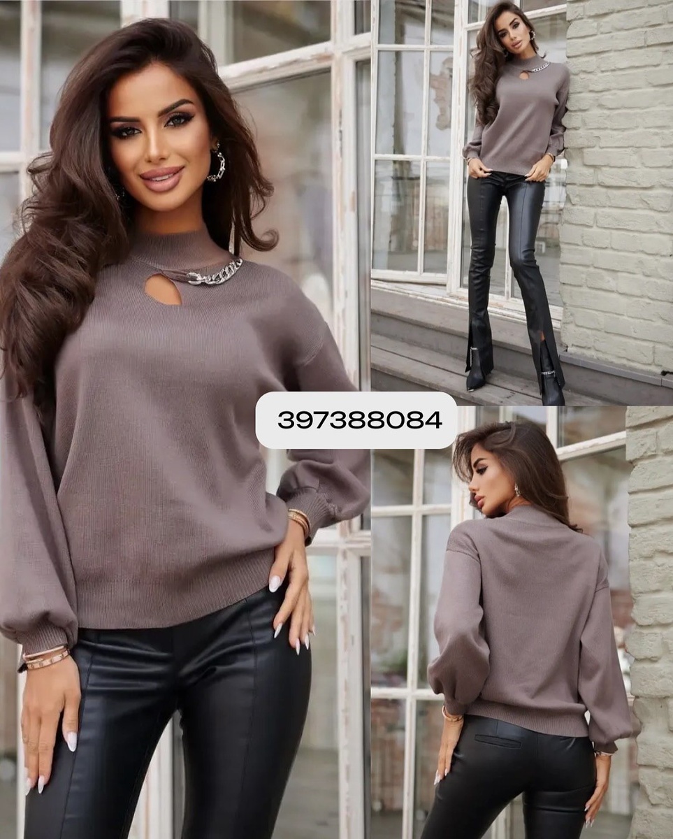 Что это: мягкий полуводолаз с мини-вырезом на груди и декоративной цепочкой-воротником. Рукава-буфы с манжетой, эластичная резинка по низу.