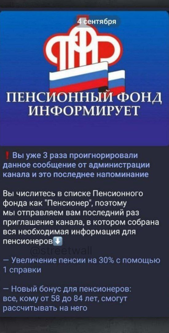 Мошенники рассылают поддельные сообщения от Пенсионного фонда России, сообщило МВД. ────────── ⚡️Важные новости – без лишнего шума!⚡️ Подпишись на канал и получай только суть: оперативно, чётко, по делу! 👉 ИнфоСплетник | @infospletnik