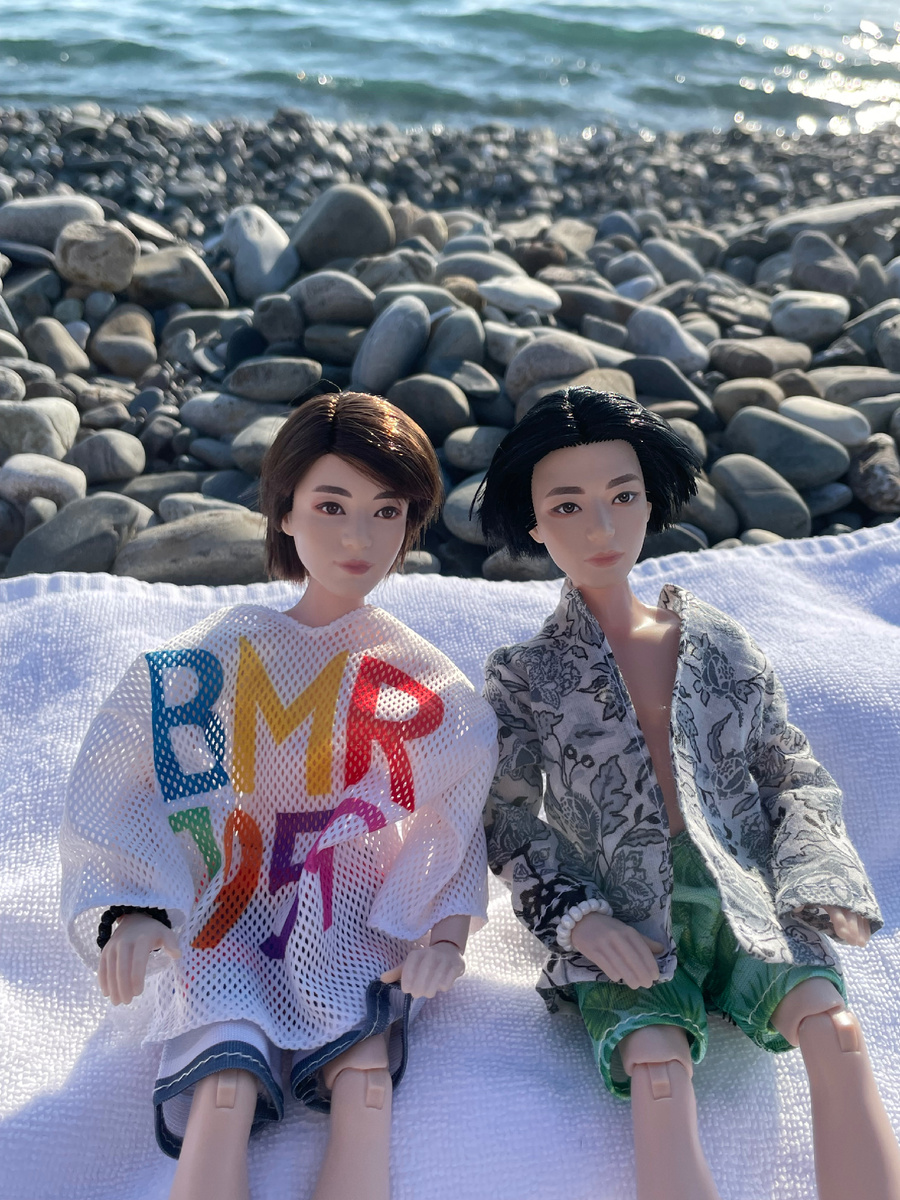 Отдохнув после перелёта, ребята выбрались на пляж. Решили пойти на отдалённый, куда ходят в основном местные. Море спокойное, иногда накатывают волны. Чонгук надул круг: Тэхён не решился идти с ним в воду, решил позировать так: Приходя на пляж, главное не забыть пользоваться солнцезащитным кремом. И конечно обязательно взять с собой бутылочку воды. Ребята подготовились) Теперь и позагорать можно: Тут Тэхён решил попозировать на фоне проплывающих яхт: Тэхён просто отдыхает, лёжа на полотенце: А Чонгук построил каменную башню: Чонгук нашёл интересный камень: Тэхён не решился нырнуть в воду, сидел на берегу и любовался морем: Чонгук оказался посмелее: Глубоко в воду не лезли, но всё равно промокли. Поэтому переоделись в сухие шорты: Вот так ребята провели время на пляже. Напоследок популярные фото из серии Кукла в ладошке: Всем спасибо за внимание 💜💜💜
