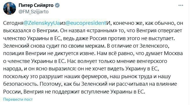 Министр иностранных дел Венгрии Петер Сийярто заявил, что страна не поддержит вступление Украины в Европейский Союз, несмотря на отсутствие