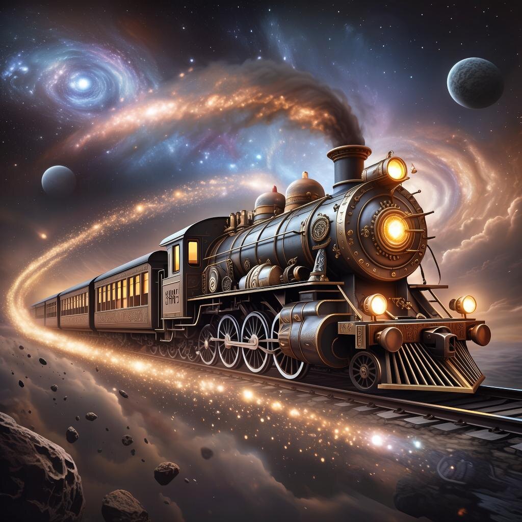 Однажды вечером звезды засияли ярче обычного, словно приглашали взглянуть на небеса внимательнее. Именно тогда Алексей заметил нечто странное: среди привычных созвездий появилась новая линия света, протянувшаяся через всю галактику. Это был не метеоритный дождь и не комета. Нет, это было гораздо удивительнее... Это был Галактический Поезд! Глава 1. Начало путешествия Алексей стоял на станции космической гавани Земля. Здесь, на окраинах Солнечной системы, ожидал прибытия самый необычный транспорт человечества — Галактический Поезд. Этот чудо-поезд путешествовал не только сквозь пространство, но и сквозь время, открывая перед своими пассажирами тайны далеких миров и эпох. — Следующая остановка: Андромеда, произнес механический голос диспетчера, и сердце Алексея замерло от волнения. Поезд прибыл ровно в назначенное время. Его вагоны были выполнены из неизвестного материала, светящегося мягким голубым светом. Двери распахнулись, приглашая внутрь. Внутри поезда царила особая атмосф