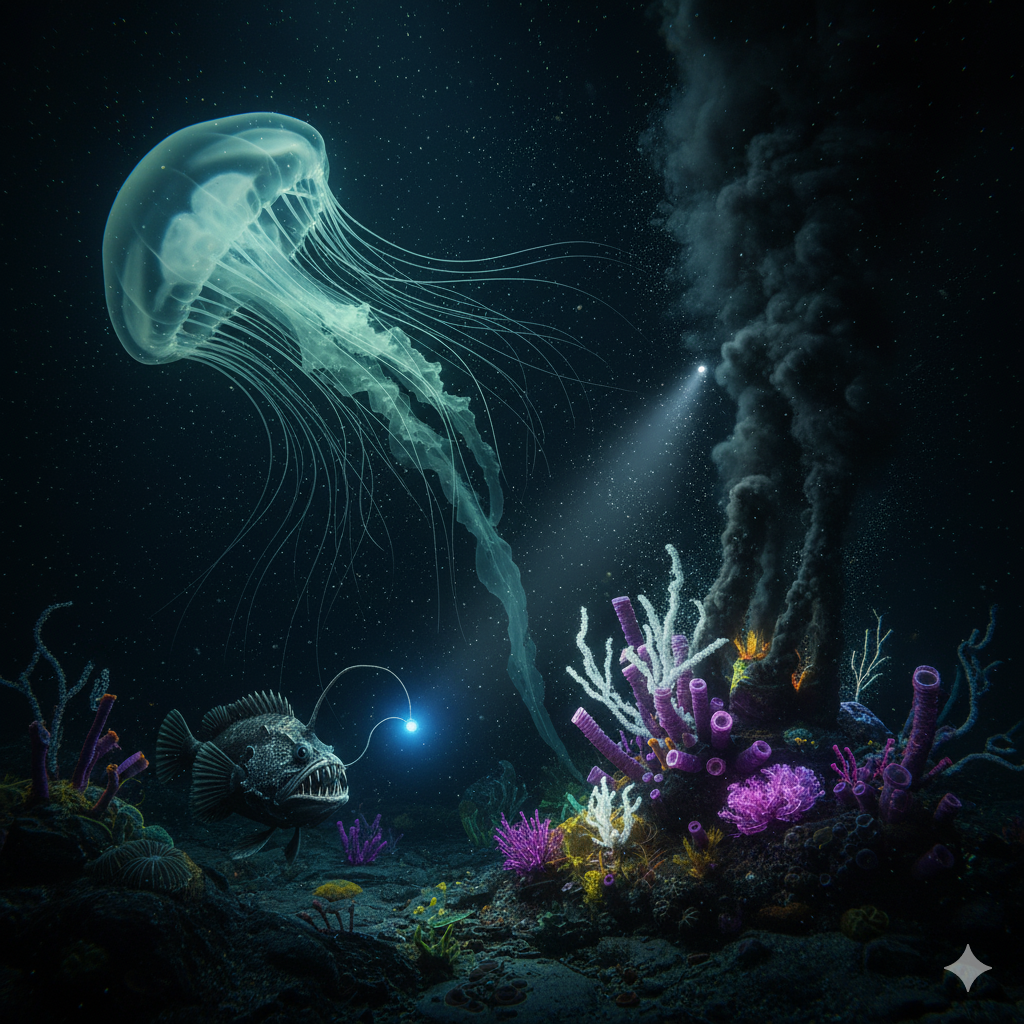 Морские глубины всегда манили человека своей неизведанностью. Мы изучили менее 10% океанского дна, а ведь там, в непроглядной тьме, скрываются самые невероятные создания и явления. Готовы погрузиться? Самая глубокая точка на Земле — это Марианская впадина. Её глубина — около 10 994 метров, что более чем на 2 километра глубже, чем высота Эвереста. Давление на дне — более 1100 атмосфер. Удивительно, но даже в таких экстремальных условиях существует жизнь. Учёные обнаружили там глубоководных рыб, гигантских амфипод и микроорганизмы. Солнечный свет проникает в воду только на глубину до 200 метров. Всё, что ниже, погружено в абсолютную тьму. Эта зона называется баттиальной (от 200 до 4000 метров) и абиссальной (от 4000 до 6000 метров). Из-за отсутствия света здесь не может существовать фотосинтез, поэтому жизнь приспособилась к другим источникам энергии. Многие организмы используют биолюминесценцию — способность светиться. Глубоководные рыбы, кальмары и медузы могут создавать свет для прив