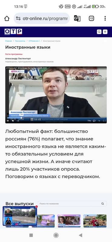 Недавно пригласили выступить в качестве эксперта по языкам на телеканал ОТР (общественное телевидение России). В эфире прозвучали результаты опроса: Значения, конечно, невероятные. Однако, важно отметить, что Россия не является в этом смысле какой-то уникальной. Все привыкли думать, мол, в России плохо с иностранными языками. Однако, примерно такие же цифры — и в США, и в Китае, и в Индии, и в странах ЕС. Малая часть населения владеет иностранными языками. Но одно дело — владеть, или не владеть. Это вопрос техник, желания, мотивации, инструментов, возможностей. Другой вопрос — возможность их изучать. Возможность такая должна быть у всех, не правда ли? А вот только что вышел материал, где сказано, что количество часов иностранного языка в школах сокращают. Казалось бы, ну и ладно — в школе живой язык не выучишь, как правило. Но ведь это лучше, чем ничего. Мне кажется, что когда человек даже не попробовал поизучать иностранный язык, тот или иной — он упускает огромный пласт знаний и воз