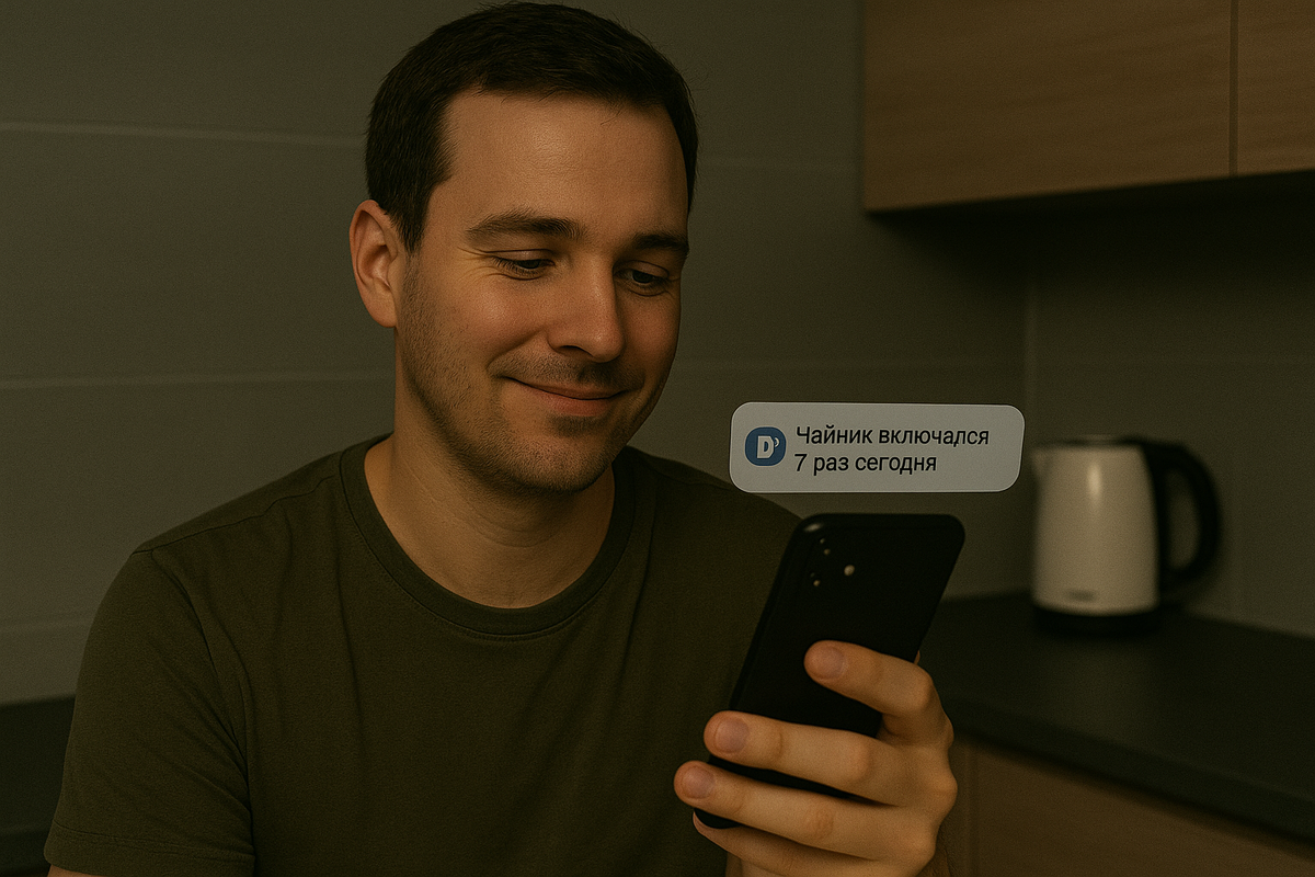 Через неделю хозяин заметил в приложении: чайник включался по 6–7 раз в день. Дом прислал отчёт: «Ваш чайник потребил больше всего энергии на этой неделе».