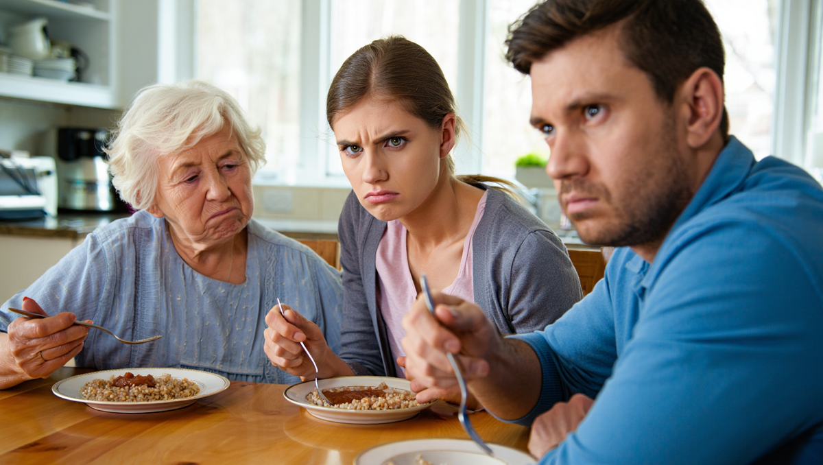 Мы садимся ужинать. Я раскладываю еду, Антон сразу начинает есть — он всегда голодный после работы. Анна Петровна смотрит в свою тарелку с сомнением, ковыряет вилкой гречку, пробует подливу и морщится.