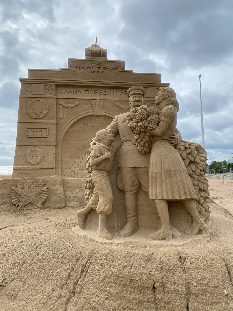 В Парке 300-летия Санкт-Петербурга уже несколько недель идёт бесплатный фестиваль песчаных скульптур. Но если вы все еще не успели его посетить - на этих выходных есть отличная (и последняя) возможность, ведь 7 сентября - последний день выставки. С 22 августа до 7 сентября пляж парка 300-ления Санкт-Петербурга превращён в музей под открытым небом. Здесь можно прогуляться среди песчаных фигур, созданных лучшими скульпторами из разных городов России. Каждая работа, естественно, посвящена Санкт-Петербургу - его истории, культуре, героям и победам. Кстати, данный фестиваль проходит в городе уже второй раз. И тема фестиваля в этом году - "Город победителей". Центральная работа экспозиции - величественная Триумфальная арка "Слава победителям". Она напоминает о 1945 годе, когда для встречи солдат-победителей рабочие заводов всего за несколько дней возвели временную арку в честь возвращающихся с фронта. Но есть еще несколько интересных работ. Например, мне особенно понравились скульптуры, по