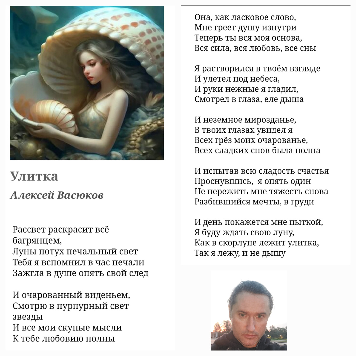 Рассвет раскрасит всё багрянцем, Луны потух печальный свет Тебя я вспомнил в час печали Зажгла в душе опять свой след И очарованный виденьем, Смотрю в пурпурный свет звезды И все мои скупые мысли К тебе любовию полны Она, как ласковое слово, Мне греет душу изнутри Теперь ты вся моя основа, Вся сила, вся любовь, все сны Я растворился в твоём взгляде И улетел под небеса, И руки нежные я гладил, Смотрел в глаза, еле дыша И неземное мирозданье, В твоих глазах увидел я Всех грёз моих очарованье, Всех сладких снов была полна И испытав всю сладость счастья Проснувшись, я опять один Не пережить мне тяжесть снова Разбившийся мечты, в груди И день покажется мне пыткой, Я буду ждать свою луну, Как в скорлупе лежит улитка, Так я лежу, и не дышу