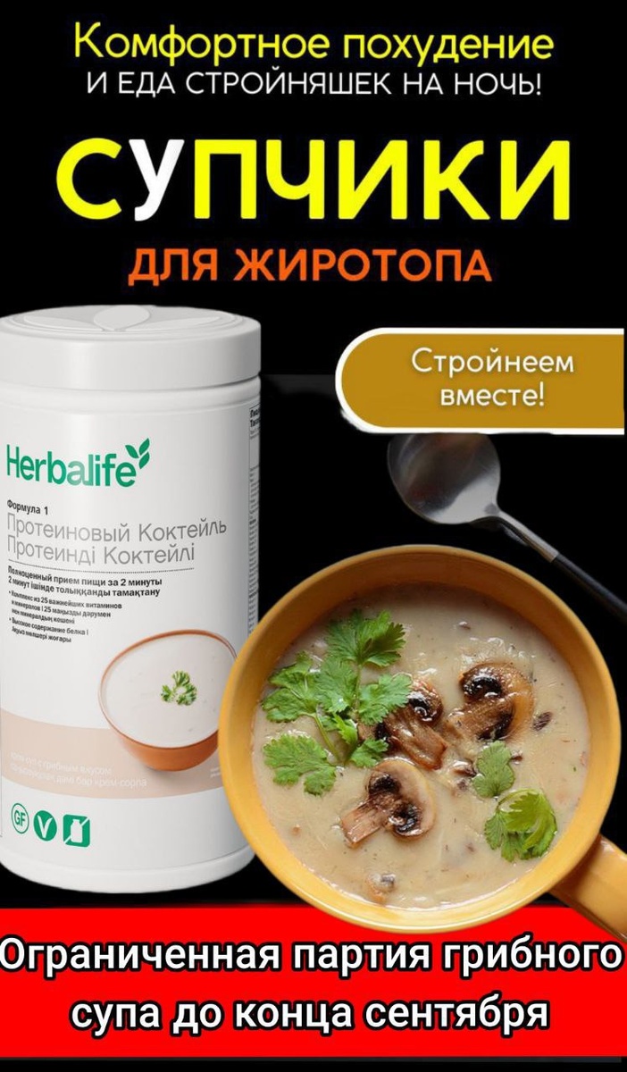 Ф1 Грибной крем-суп - Преимущества 🍜 Формула 1 - Грибной крем-суп Это сбалансированная еда с высоким содержанием белка, которой можно заменить полноценный приём пищи, при этом обеспечив организм необходимым набором питательных веществ. В составе высококачественный белок, пищевые волокна, комплекс из 25 важнейших витаминов и минералов, и всего 95 ккал в порции.