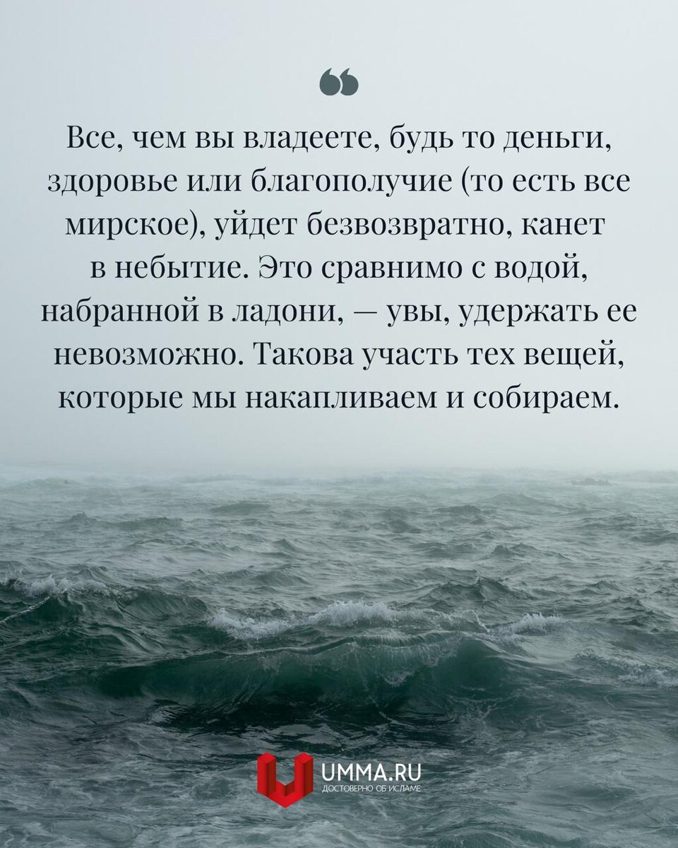 “А все, что у Господа, — вечно” (см. Св. Коран, 16:96). Действительно, Он дарует нам все, чем мы обладаем: силы, здоровье, возможности… Одновременно Всевышний испытывает нас: сумеем ли мы этим правильно воспользоваться, сможем ли перенести эти “дары”, являющиеся кратковременным удовлетворением наших нужд в этом мире, в мир вечного блаженства или превратим их в груз, который опустит нас на самую низшую ступень Ада...