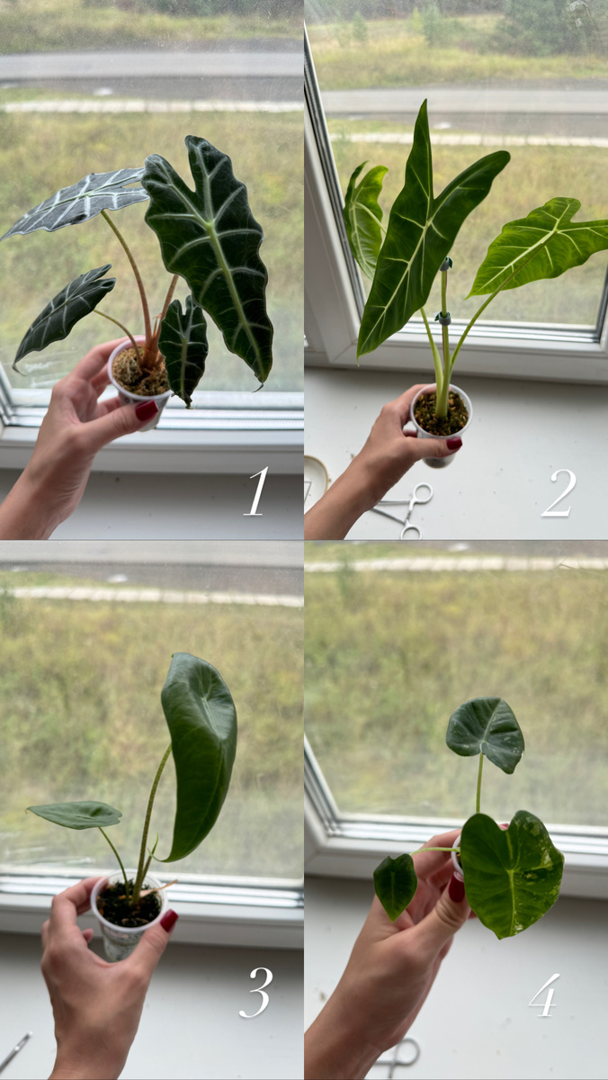 Всем привет! Со мной сегодня произошла настоящая растительная магия! ✨ Мой молодой человек ездил на конференцию в другой город, а я… я нашла на Авито алоказию своей мечты! Итог поездки — не только его доклад, но и целая охапка зеленых сокровищ! 😍 Знакомьтесь, моя новая рота: 1. АЛОКАЗИЯ АМАЗОНИКА СПЛЭШ (№1 на фото) — та самая, ради которой все и затевалось! Это настоящая королева с огромными, будто раскрашенными художником, листьями. Белые прожилки на изумрудном фоне — это просто космос! 🪐 Я ее увидела и поняла — must have! 2. АЛОКАЗИЯ МИШОЛЬЦА (Михольца) (№2) — малыш-монстрик! 👾 Его листья темные, глянцевые, с яркими белыми прожилками. В детстве он выглядит очень компактно, но поверьте, у него амбиции большого дерева! Вырастет в огромного эффектного красавца. 3. АЛОКАЗИЯ ЛОНГИЛОБА «КОБРА» (№3) — это что-то нереальное! 🐍 Его длинные, заостренные листья и правда напоминают капюшон кобры. Очень архитектурная и стильная штука. Жду не дождусь, когда она покажет весь свой характер!