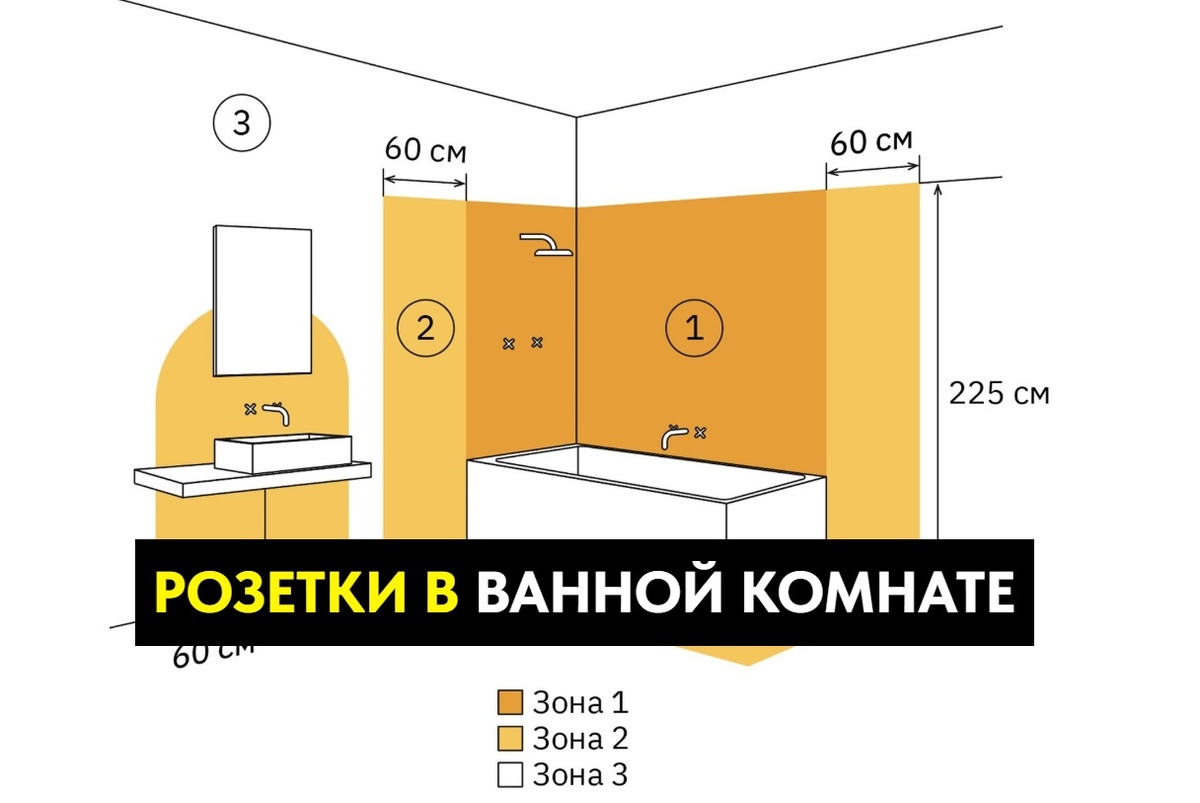 ⚠️ Зона 2 — пространство на расстоянии 60 см по горизонтали от зоны 1. Здесь устанавливать розетки запрещено из-за высокого риска попадания брызг, которые могут вызвать короткое замыкание даже у защищённых моделей.