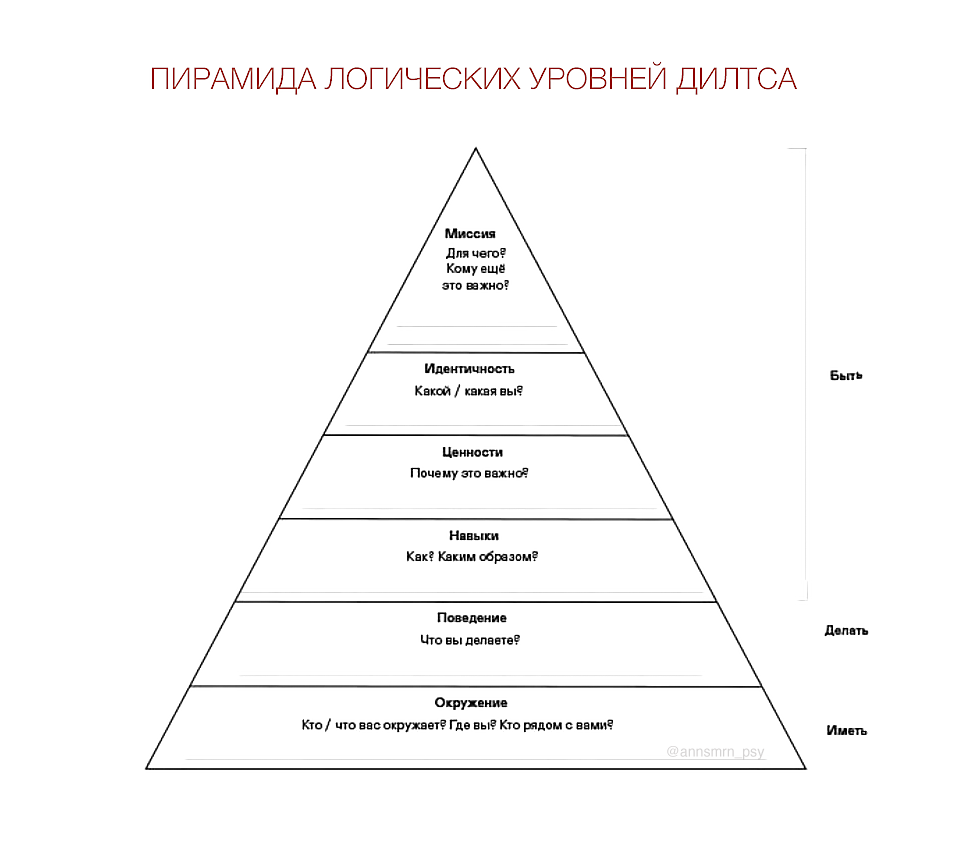 Представьте себе инструмент, который может помочь разложить по полочкам любой жизненный вопрос, увидеть его под новым углом и найти неочевидные, но самые эффективные решения. Такой есть у меня и я спешу им поделиться с вами! Этим инструментом является Пирамида логических уровней Роберта Дилтса – роскошная модель из мира НЛП, разработанная одним из её основателей. Что такое Пирамида Дилтса? Это целая иерархия из 6 уровней, которые влияют друг на друга. Они позволяют наглядно увидеть, что решение проблемы часто скрывается на один, а то и два уровня выше её проявления. Главная задача пирамиды – помочь выявить истинную причину трудностей и найти путь к их устранению. Как она работает? Она полезна для структурирования информации, логического выстраивания мышления и даже формирования речи. С её помощью вы сможете "под лупой" рассмотреть любой аспект вашей жизни, разделить его на составляющие и понять, как всё взаимосвязано. Модель универсальна и применима практически ко всему, поэтому я час