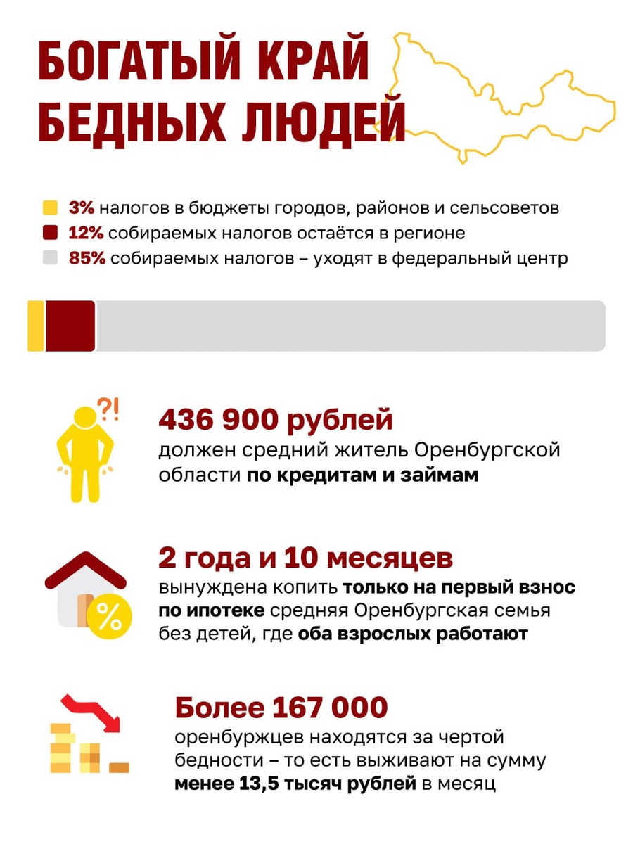 🔖 Богатый край бедных людей: как в Оренбуржье справляются с бедностью? Наш край богат природными ископаемыми, талантливыми людьми... Но жители в нём бедные. Смотрите сами: — 436 900 рублей должен средний житель Оренбуржья по кредитам и займам — Более 167 000 жителей региона находятся за чертой бедности, то есть выживают на сумму менее 13,5 тысяч в месяц (не говоря уже о пенсионерах и работниках, чей доход не дотягивает до 30 тысяч рублей) — 2 года и 10 месяцев вынуждена копить только НА ПЕРВЫЙ ВЗНОС по ипотеке средняя оренбургская семья, где оба взрослых работают Какая в таких условиях демография? Не помереть бы... Уместно будет вспомнить и про то, как распределяются налоги, собираемые у нас в регионе: 85% — в федеральный бюджет, потому что это в основном нефтегазовые доходы и НДС, около 12% в региональный бюджет, и лишь 3% — в города и села Оренбуржья, которые хронически недофинансированы примерно в 2-3 раза. Ситуация очень печальная. ❓Что делать? Поддерживать прежде всего тех, кт