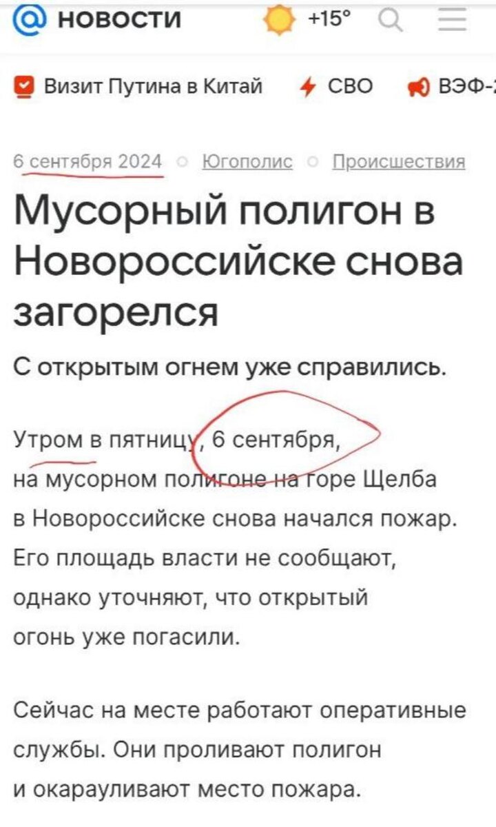 Напомним, свалка на Щелбе загорелась сегодня утром. Согласно официальным данным, площадь горения на данный момент составляет около 900 м.кв. Сейчас специалисты отсыпают грунт, чтобы локализовать пожар. В ликвидации пожара задействовано 19 единиц спецтехники, привлечено 29 человек. Между тем, читатель "Блокнота" обратил внимание на некую закономерность: в 2024 году пожар на Щелбе тоже произошел 6 сентября. "Совпадени