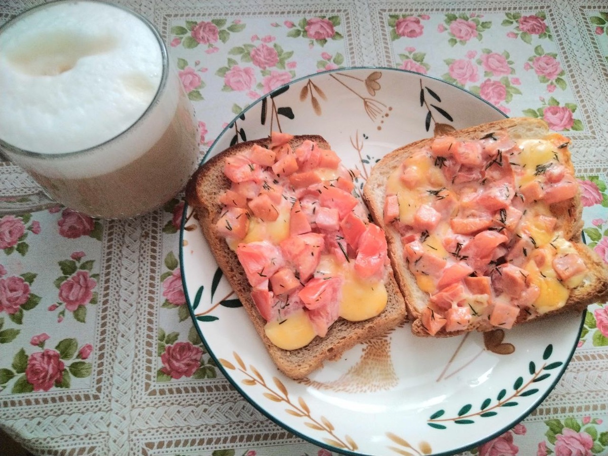 Здравствуйте мои дорогие читатели! В Санкт-Петербург опять вернулось лето, сегодня весь день солнечно, дует теплый ветерок. Мы с Миланой приготовили вкусный и простой завтрак, что-то похожее на пиццу, но не она, а горячие бутерброды. У меня с ветчиной, помидором, сметаной,зеленью и сыром. И кофе с молоком без сахара. А у Миланы с величиной, сыром и сметаной, и водичка. Дочка не любит помидоры и зелень, поэтому готовлю ей отдельно. Завтрак плотный, потому что у Миланы сегодня занятие в художественной студии. Рисовать дочка любит, старается ) Пока она трудиться, я без дела не сижу, вам наши новости рассказываю. Вчера мы с дочкой ходили на пробное занятие по художественной гимнастике. Милане все очень понравилось, она старалась, и не баловалась. Фото только такие получилось сделать, Я за ней немного подглядывала) Нам теперь предстоит сделать важный выбор, остаться на танцах, или перейти в гимнастику. Дочке нравится и там, и там) На танцах сейчас подготовка сложнее, там очень интенсивная