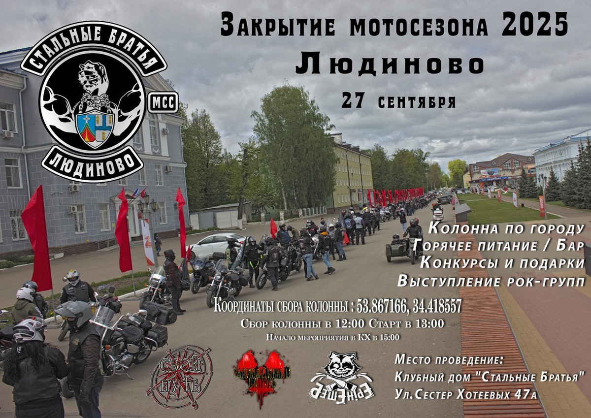 🔁 Дальняк.рф™: 27 СЕНТЯБРЯ -ЗАКРЫТИЕ МОТОСЕЗОНА 2025!!!! 12:00 - СБОР КОЛОННЫ НА "ГАЗУ" (53.867370, 34.417722) 13:00 - СТАРТ КОЛОННЫ ПО ГОРОДУ 15:30 - КОНЦЕРТНО - КОНКУРСНАЯ ПРОГРАММА В КЛУБНОМ ДОМЕ "СТАЛЬНЫЕ БРАТЬЯ" (Людиново/ул. Сестёр Хотеевых 47а) По традиции: ЖИВАЯ МУЗЫКА: Группа "Свой Путь" 16:00 - 17:00 РАДИОАКТИВНЫЙ ПАТРУЛЬ 18:00 -19:00 Бешеные! 20:00 - 21:00 Далее ПЬЯНЫЕ ВОПЛИ ПОД ГИТАРУ! ТРАДИЦИОННЫЕ КОНКУРСЫ; ПРИЗЫ ОТ КЛУБА МСС"СТАЛЬНЫЕ БРАТЬЯ"; БАР "СЫТЫЙ КАБАН"; АТРИБУТИКА; ТЕПЛАЯ ДРУЖЕСКАЯ АТМОСФЕРА, ДРАЙВ и ЖИВОЕ ОБЩЕНИЕ! ВХОД СВОБОДНЫЙ!!!