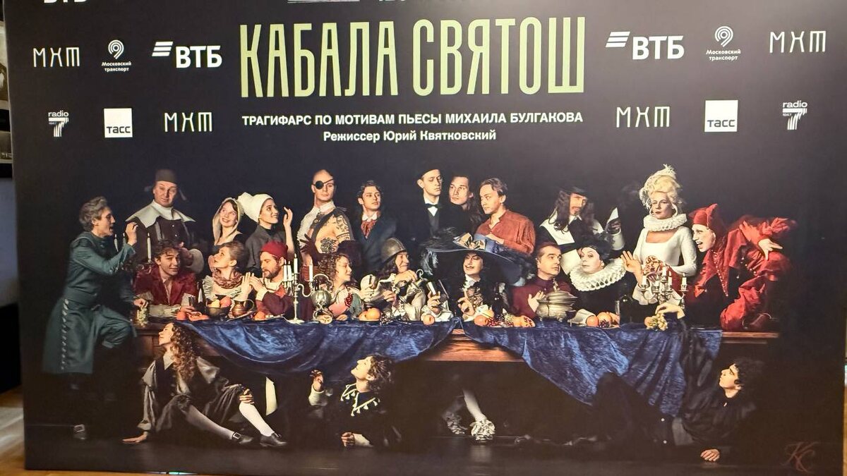 «Кабала Святош». Трагифарс по мотивам пьесы Михаила Булгакова. Театр МХТ им Чехова Режиссер Юрий Квятковский Продолжительность: 3 часа с антрактом Юрий Квятковский рассказал, что идея спектакля родилась год назад. Как только было принято решение ставить «Кабалу святош», в тот же день он позвонил Николаю Цискаридзе сразу же получил его согласие исполнить роль Людовика. Юрий отметил, что именно Николай, как никто другой, перелопатил гору материала о своем герое, прочитал множество книг и привнес свое видение в спектакль! И вот состоялась премьера спектакля "Кабала святош" по мотивам пьесы Михаила Булгакова. Честно говоря, перед показом я немного переживала, что оригинал пьесы знаю плохо, но оказалось зря. Спектакль действительно получился по мотивам. На мой взгляд, постановка получилась очень злободневной, местами даже мне показалось, что чересчур. "Все всё понимают!" Поэтому желаю многие лета спектаклю! А то, как сказал режиссер Юрий Квятковский, из "московских окон" надуло очень мно