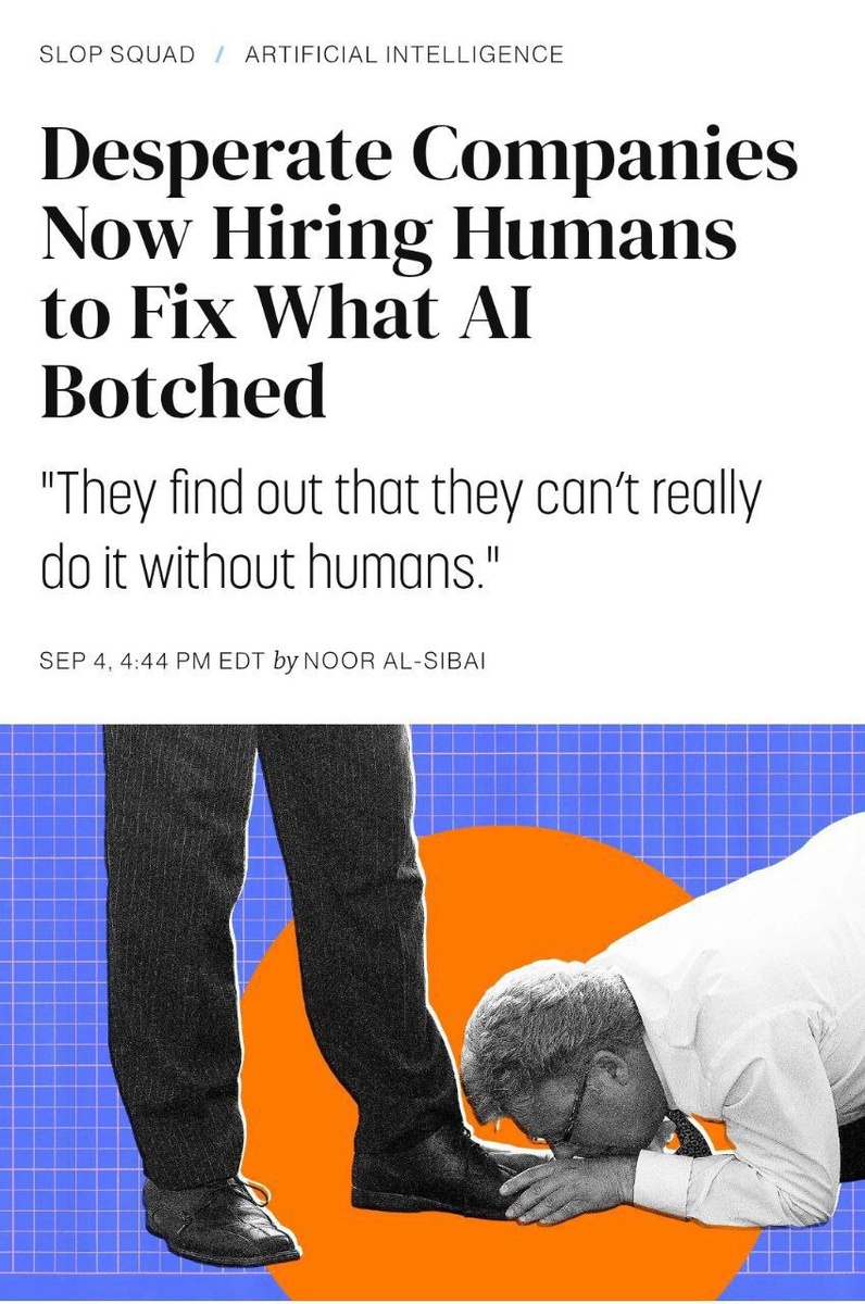 КАМБЭК людей — бизнес срочно нанимает «чинильщиков» ИИ-контента. Компании, уволившие сотрудников «ради ИИ», теперь ищут фрилансеров для исправления косяков. Появилась новая профессия — чинильщик. Доход — до 2500 долларов в месяц. Что чинят: • Художница правит размытые логотипы. • Писатель вычищает штампы и добавляет смысл в тексты. • Программист закрывает дыры в «вайбовых» приложениях. Парадокс: такие правки часто дороже, чем если бы работу сразу делал человек.