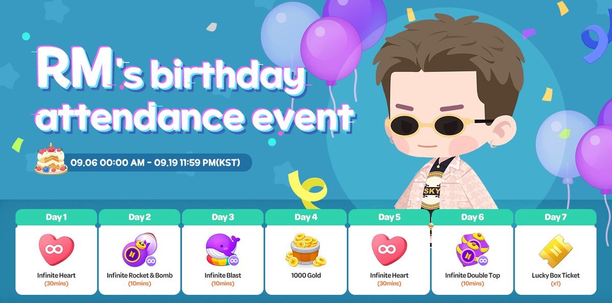 🍊 BTS Island In the Seom в X: 🎉 Акция входа в честь дня рождения RM. По случаю дня рождения лидера стартовала акция ежедневного входа! Заходите каждый день и получайте разнообразные награды! 🐨💝 🏝 Ссылка на игру #InTheSeom @kumihobts
