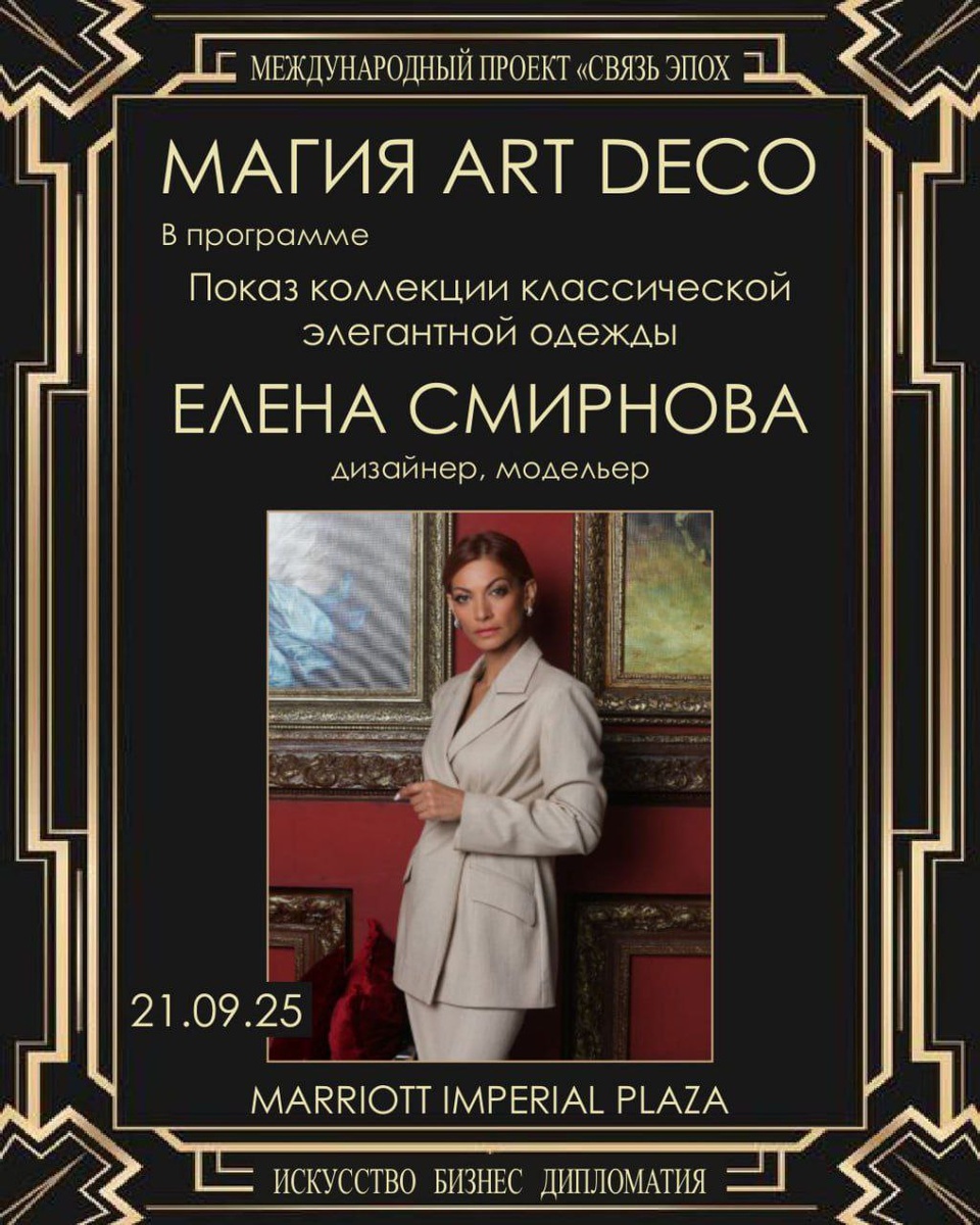 ⚜️ 21 сентября с 15 до 20! Приглашаем Вас в Marriott Imperial Plaza на фееричное событие "МАГИЯ ART DECO" ! Это больше, чем Вечер искусства– это погружение в эпоху изысканной роскоши, волнующей чувственности, королевского комфорта и восхитительного гламура! Хрустальные люстры Baccarat, белоснежный мрамор, блеск зеркал, геометрические орнаменты, глянцевые текстуры создадут атмосферу изящества и величия. Музыка, танцы, мода, кино сольются в едином сияющем потоке. Высокая эстетика, совершенство архитектуры, таинственные силуэты эпохи, неукротимая энергия века джаза, завораживающие ритмы, чарующие ароматы, волшебные пузырьки в бокалах с игристым🥂 , вкусные блюда и кофе с десертом от шеф- повара ресторана пятизвёздочного отеля вызовут калейдоскоп красочных эмоций. Самое главное— это замечательное общество, созвездие талантливых, харизматичных личностей! 🎻🎷 EXTRA-TIME JAZZ BAND создаст магическую атмосферу праздника, пригласит в музыкальное путешествие по Франции, Италии, США, латино-