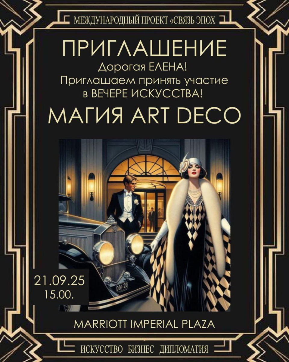 ⚜️ Очень ценно ❤️🔥 и приятно получить приглашение. Елена, добрый день! Приглашаю принять участие в Вечере искусства "МАГИЯ ART DECO", который состоится 21 сентября с 15 до 20 в Marriott Imperial Plaza в рамках Международного проекта "СВЯЗЬ ЭПОХ"! ⚜️ Также со своей стороны, я приглашаю вас быть гостями или моделями на мероприятии. ⚜️ Писать в л. с @brilliant369 для уточнения интересующей информации, дорогие.