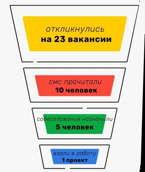 В такие моменты нужно гордо отвечать: да, было 😎 Но точно не стоит унывать, потому что дело не в вакансиях или работадателях 👌 Если вы ищете работу в проверенных чатах (делились ими тут) И пишете отклики по всем правилам (почитать об этом тут) — а результат всё равно нулевой, дело может быть просто в количестве ваших откликов 😉 💡 Принцип такой: чем больше вакансий вы охватите, тем выше шанс получить ответ и проект 👉 Рекомендуемая норма минимум 5–10 откликов в день Почему? 🔵 кто-то может просто не увидеть ваше сообщение 🔵кто-то выберет более быстрого кандидата 🔵кто-то решит, что ваш опыт пока не подходит 🙅♀️ Так что не стоит рассчитывать, что с первого же отклика вы получите проект 🔥 Но можно ускорить процесс: Дополнительно разместите свою визитку в соцсетях или в чатах — тогда клиенты смогут найти вас сами Тут решает системность и дисциплина. Чем больше откликов — тем ближе первый клиент 🔥 ➖➖➖➖➖➖➖ Больше полезных материалов по поиску заказчиков у нас на Фриланс Старте