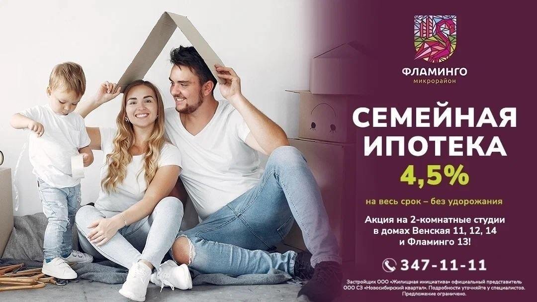 Внимание! Напоминаем, что в микрорайоне Фламинго можно купить жилье по акции! Действуют программа Семейная ипотека 4,5%. Специальное предложение распространяется на 2-х комнатные студии в домах Венская 11, 12, 14 и Фламинго, 13. На весь срок - без удорожания! У вас есть возможность выбрать жилье с чистовой отделкой или ремонтом. В отделе продаж вас проконсультируют и помогут сделать выбор. Строим город, в котором хочется жить! Наш сайт: www.nsk-kvartal.ru