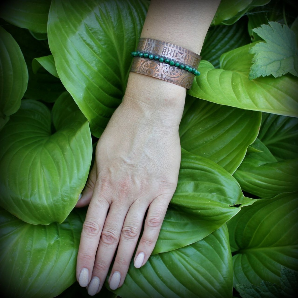 Широкий медный браслет Э'н'тааль , с хризопразом Широкий браслет ручной работы из листовой меди и камней. Оригинальный дизайн. Браслет изготовлен с использованием техник травления, холодной и горячей ковки и техники wire wrap. Интересная фактурная поверхность браслета создает образ древнего артефакта. Камни - тёмно-зелёный хризопраз с лёгкой огранкой. Ширина браслета 3,5 см. Подойдет для запястья обхватом от 16 до 24 см. Удобная регулируемая застежка. #медныесказки #ручнаяработа #медныйбраслет #широкийбраслет #браслетручнойработы #бохостиль #стимпанк #стимпанкбраслет #бохобраслет #хризопраз