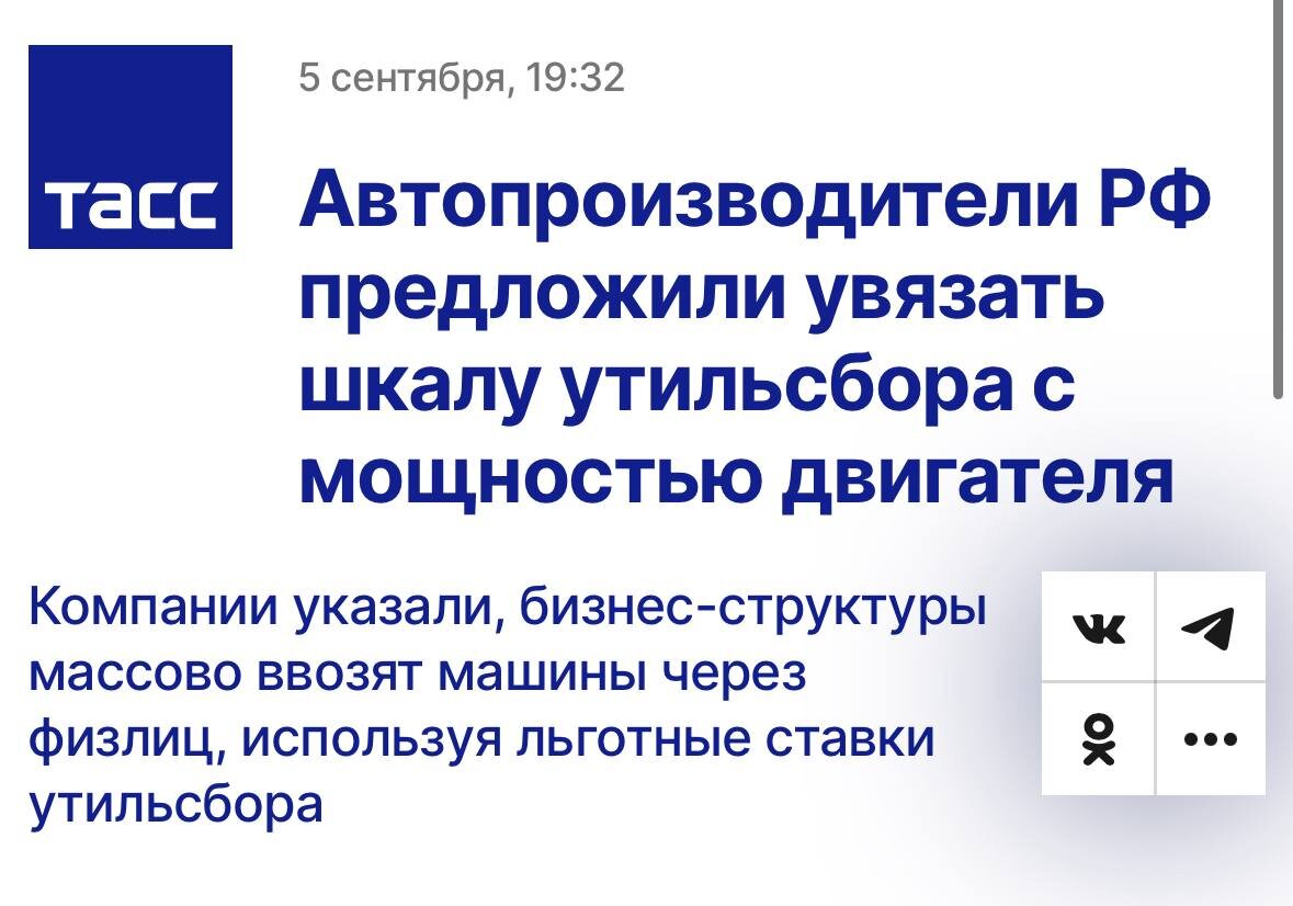 Руководители отечественных автопроизводителей КамАЗ, группы ГАЗ и Соллерс направили письмо на имя главы Минпромторга РФ Антона Алиханова с просьбой пересмотреть систему расчета утилизационного сбора на ввозимые автомобили и увязать прогрессивную шкалу прежде всего с мощностью двигателя, а не с его объемом. Производители указывают, что бизнес-структуры массово ввозят автомобили через физических лиц, используя льготные ставки утильсбора. Документ есть в распоряжении ТАСС. «Видится целесообразным актуализировать систему расчета утилизационного сбора, увязав прогрессивную шкалу прежде всего с мощностью двигателя, а не с его объемом», — сказано в письме. «Предлагается также распространить прогрессивную шкалу, увязанную с мощностью двигателя, на физических лиц, ввозящих транспортные средства для личного пользования, но с применением льготных ставок для ввоза массовых автомобилей с мощностными характеристиками до 160 л.с. (наибольшая доля среди ввозимых автомобилей)», — указывается в документ