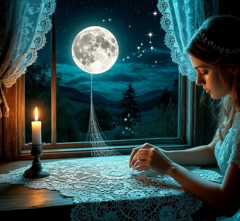 В низенькой лачуге свет горит в окошке. На скамье, у печки лижет лапу кошка. Мёдом пахнет в доме, восковой свечой, Магией волшебной, свежестью ночной. Круглая луна нитью свет свой льёт. Саахга из нитей лунных, кружева плетёт. Кружево украсит светом сны людей, Сделает сон крепким, будет сон добрей. Нить свою мотает, да узоры вьёт, О своём мечтает, слово в нить плетёт. «Пусть волшебным будет, сказочным мой сон. Долгим, крепким будет, всем приснится он! На земле нет боли, нет болезней, хвори. Всем всего хватает, зависти никто не знает. Нет ни жадности, ни лести, Нет агрессии, нет мести. Чистит сон от гадкого, дурного. Чистит сон от ненависти, зла земного. Нет ни войн, ни крови. Узелок свой ставлю я на этом слове. Счастлива пусть будет каждая Душа,
