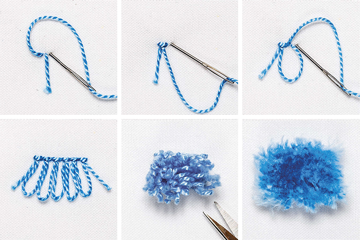 Предлагаю познакомиться с одним из самых необычных швов из вышивальной коллекции, известного как узел Гиордес. Звучит странно, но вы, возможно, удивитесь, но это действительно очень полезный шов. Шов или узел Гиордес (другое название - турецкий шов) используются для создания бархатистого ворса, который формируется путём оставления каждой второй петли в виде петли, которую затем разрезают и расчёсывают. Наиболее эффектно этот узел получается при работе с хлопковой пряжей перле (можно использовать нитки ирис или мулине в несколько сложений). Узел идеально подходит для создания верхушки чертополоха, добавления травы на луг или создания пушистого тельца шмеля! При работе с узлами Гиордес вы обнаружите, что чем ближе расположены петли друг к другу, тем толще получится плюш после разрезания и расчёсывания. Независимо от формы вышиваемого фрагмента, узлы Гиордес следует вязать по прямым линиям, чтобы избежать запутывания петель в ранее провязанных петлях. Во время работы придерживайте петли