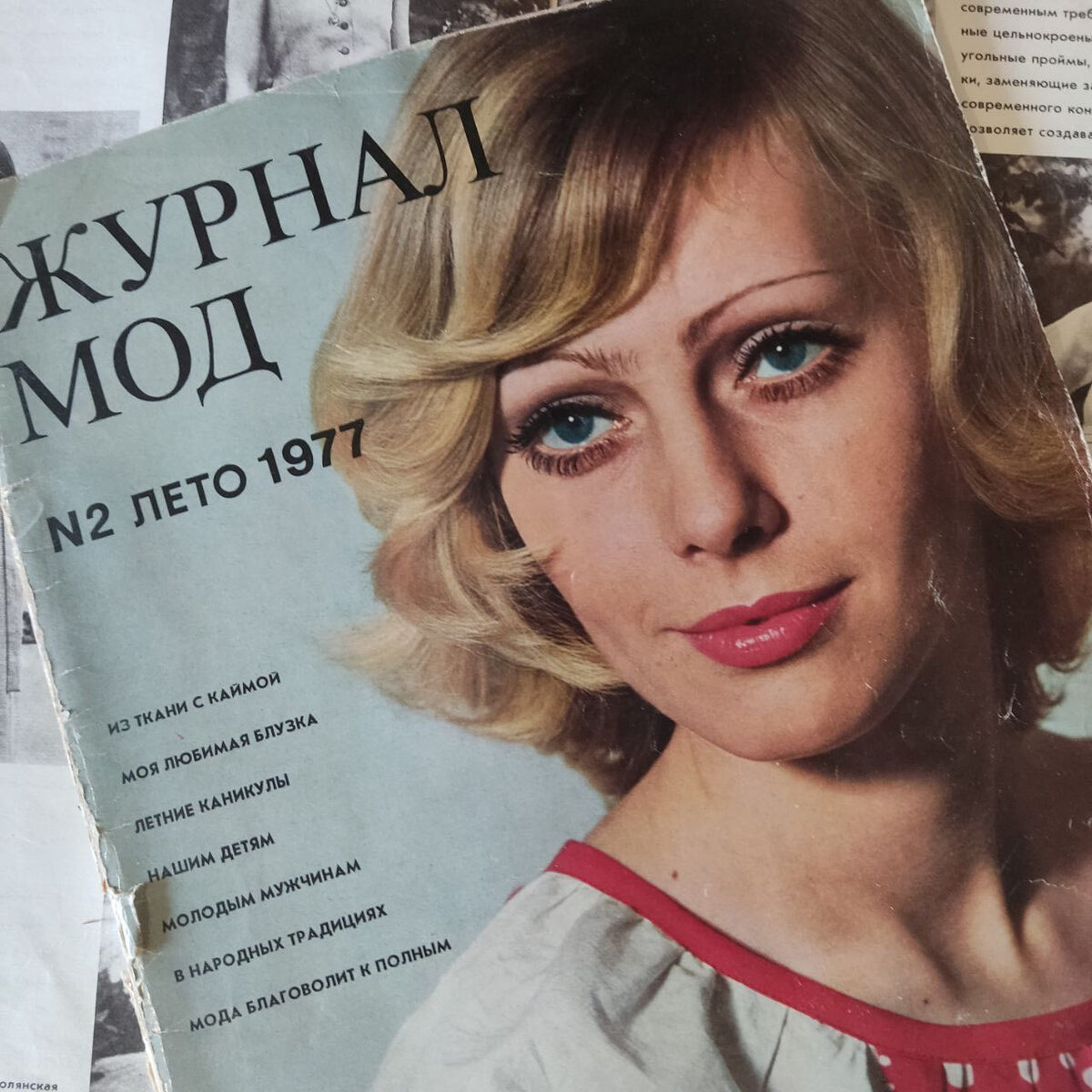 Продолжаю разбирать свои сокровища с балкона. Этот журнал «приехал» сюда скорее всего из поселка. У бабушки было много интересных журналов. Некоторые переехали сюда, наверное их привезла мама. Интересные были модели. Похожие можно и сейчас найти на маркетплейсах. Мне стали нравится такие платья. Если вы думали, что журнал черно-белый, то – нет! Очень яркий и интересный, много фото, которые вдохновляли наших мам и бабушек. А сейчас молодежь тоже носит вырез «каре» и рукава-фонарики. Статей в журнале мало, в основном фото. Но в этом есть две интересные статьи о тканях. Вот первая: Интересно почитать. Я люблю ткани. Бабушка привезла из поселка такие красивые отрезы! Хранились они конечно же с кусочками мыла, и пахнуть так приятно! Это запах из детства. Напишите в комментариях, показать бабушкины ткани? И хотя больше привлекают вот такие яркие фото, все-таки самая большая ценность этих журналов для меня когда-то было приложение с выкройками, схемами, мастер-классами (как это бы называлось