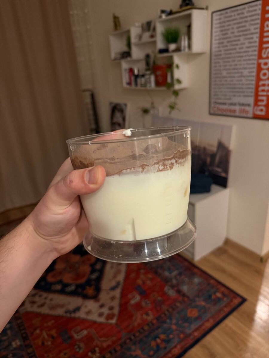 протеиновый коктейль на 100г белка - 1 банан - 1 скуп протеина (мне шоколадный по душе) - 1 греческий йогурт - 1 exponenta skyr (лучше пломбирный) - немного молока (банановое растительное, в моем случае) P.S. количество компонентов и белка в порции вы можете варьировать по своему желанию #протеин