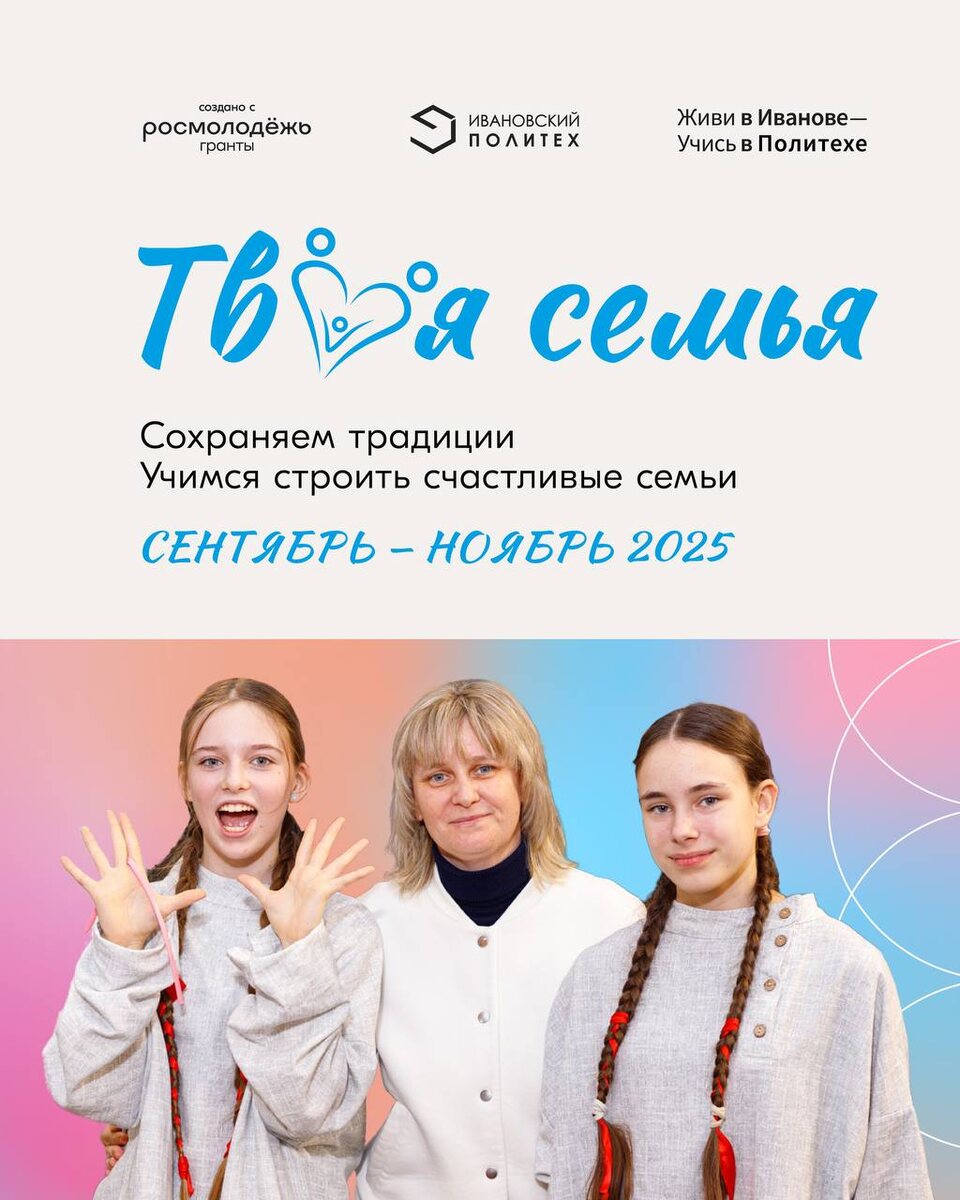 Хочешь создать крепкую и счастливую семью? 💪❤️ Ивановский Политех запускает проект «Твоя семья» — здесь вас научат всему, что для этого нужно! С сентября по ноябрь вас ждёт цикл мероприятий для молодежи 14–35 лет, посвящённых семейным ценностям 👨👩👧👦 Что будет: 🎓 «Школа будущих родителей»: лекции, мастер-классы, тренинги 🎬 Кинопоказы и дискуссии о семье 💍 Семинары по подготовке к браку 🎨 Творческая мастерская для детей и студентов 📸 Фотовыставка «Моя крепкая семья» 📝 Конкурс эссе «Я и моя семья» 🚍 Экскурсия в Кинешму: музеи семьи и традиций 💬 Конференция «Будущее России» с открытым диалогом Участие в проекте – это ваша инвестиция в счастливое будущие! 👉Подробности на странице проекта Проект реализуется при грантовой поддержке Федерального агентства по делам молодёжи — Росмолодёжь. #РосмолодёжьГранты #Росмолодёжь #ПолитехТвояСемья