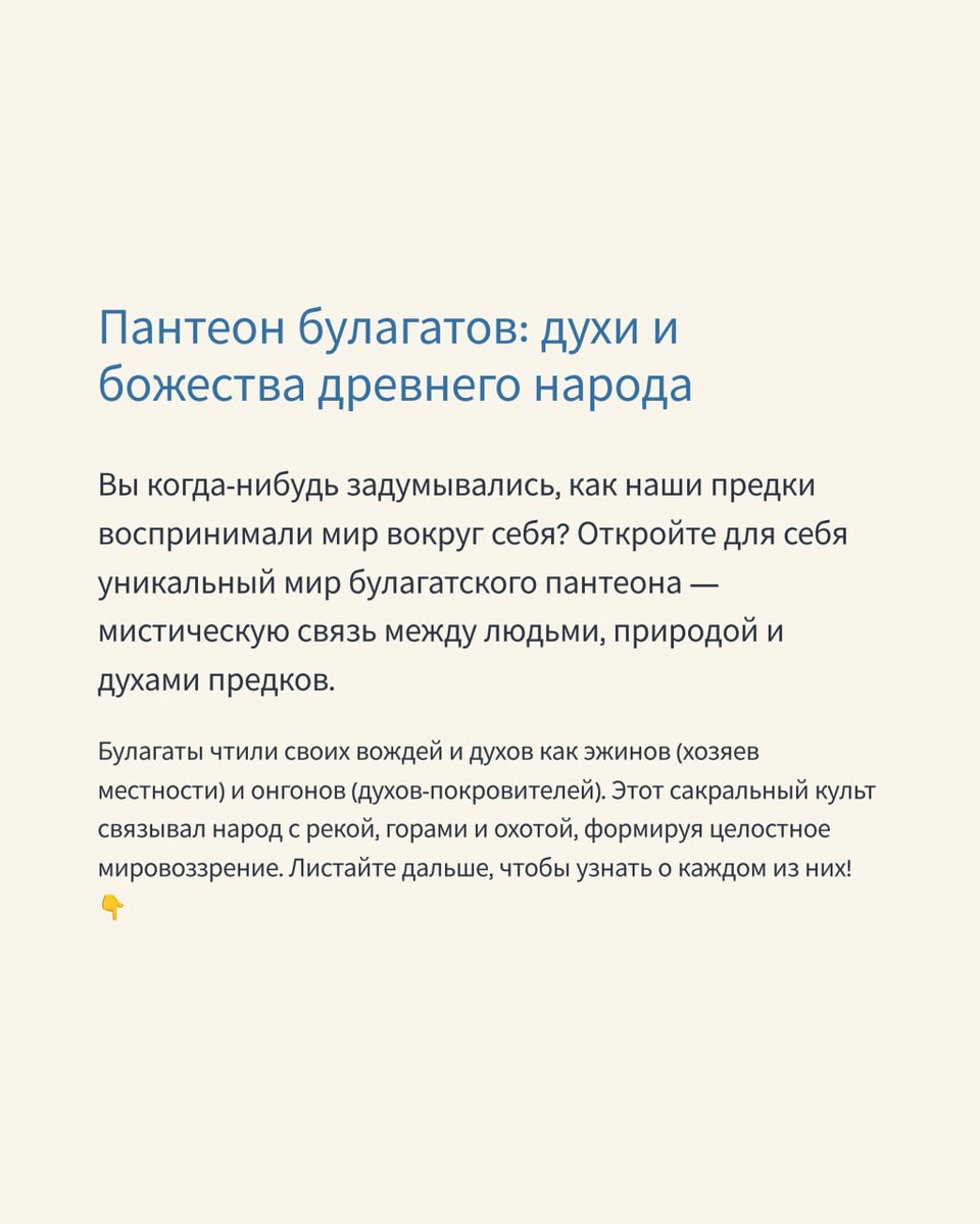 Пантеон булагатов Булагаты чтили своих вождей и духов как эжинов и онгонов. Их культ связывал народ с рекой, горами и охотой. Ещё больше интересного контента ждут тебя. 👉 Подписывайся: https://dzen.ru/id/670c7fe545d6d72caa724e37
