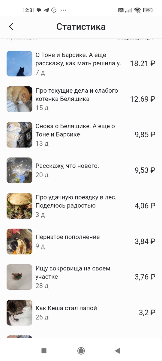 Смотрю и глазам не верю. 18.21 за статью. Это невероятно! Давно не было таких щедрых выплат. Пишу без сарказма. Некоторые блогеры пишут, что Дзен начисляет им по 500 руб в день. У меня такого не было даже в лучшие годы, когда канал активно продвигался самим сайтом, а подписчики добавлялись ежедневно. В статистику давно не заглядывала. А смысл? Несколько лет количество подписчиков примерно на одном уровне. А доходы - в прямом смысле копейки. 0,18 коп, 0,1 коп. Без слез не взглянешь. Выводила доход раз в несколько месяцев. 27 руб, 34 руб. В таком духе. И вот, чудо случилось. 18 руб - это прорыв. Возможно, сыграло роль увеличение количества публикаций. На днях аж 2 выложила. На другой день одну плюс видеоролик. И просмотры увеличились. Интересно, что стали крутиться и старые публикации, двухлетней и пятилетней давности. Значит, эта тактика работает. Будем продолжать. Зачастую пишу на бегу, так что не судите строго. Спасибо, родные, за активность, комментарии и поддержку! Помоги в
