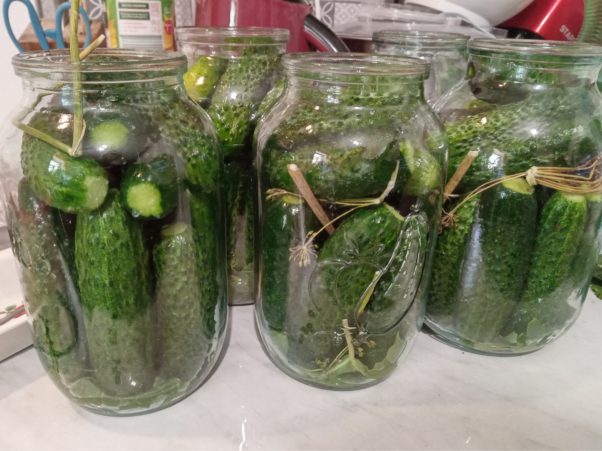 Здравствуйте , мои дорогие подписчики! Сегодня расскажу вам как я консервирую огурчики на зиму. По мнению моей семьи- это самые вкусные маринованные огурчики. Ни одной банки, приготовленной по этому не рецепту не вздулось, по крайней мере у меня и у моего окружения. Если у вас будут какие либо замечания или вопросы, обязательно указывайте их в комментариях. Постараюсь на все ответить. Итак, сначала замачиваем огурчики в холодной воде на несколько часов. Воду примерно один раз в час- полтора надо менять. Затем тщательно моем огурцы под проточной водой. Не просто в воде побултыхали, а берем новую губку и ей хорошо трем огурчики. Пока замачиваются огурчики подготовим банки для консервации. Банки я тщательно мою с моющим средством, с содой, хорошо выполаскиваю и стерилизую, крышки заливаю кипятком и оставляю на 5 минут. Далее наполняю банки травами- муравами и специями. У меня это укроп ( чем больше- тем лучше), листья хрена, листья вишни и смородины, винограда, пару зубчиков чеснока (